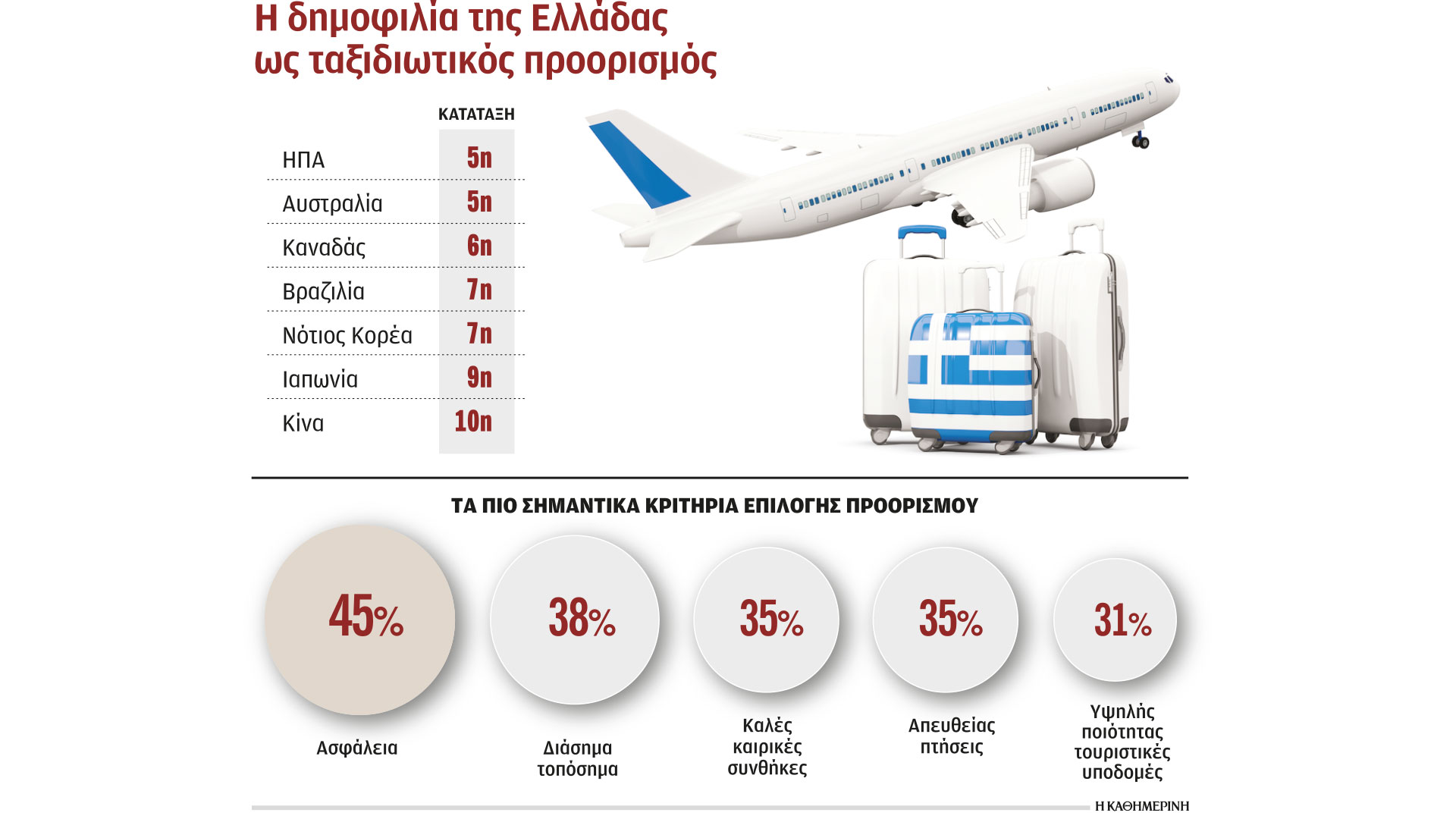 Μάλιστα, σύμφωνα με τα ίδια στοιχεία, η Ελλάδα βρίσκεται πέμπτη (5) μαζί με την Αυστρία στις προτιμήσεις των Αμερικανών όπως και των Αυστραλών που σκοπεύουν να ταξιδέψουν στην Ευρώπη φέτος, έκτη (6) στις προτιμήσεις των Καναδών, έβδομη (7) στις προτιμήσεις των Βραζιλιάνων και των Νοτιοκορεατών, ένατη (9) στις προτιμήσεις των Γιαπωνέζων και δέκατη (10) των Κινέζων. Πρόκειται για αγορές που αθροιστικά έχουν πολλαπλάσιο πληθυσμό από αυτόν της Ευρώπης και δυνητικά μπορούν να οδηγήσουν σε μια νέα εποχή ανάπτυξης αλλά και υψηλότερων εσόδων για τον ελληνικό τουρισμό, σχολιάζουν οικονομολόγοι. Σε όλες τις αγορές, 38% των ερωτηθέντων είναι πρόθυμοι να ξοδέψουν περισσότερα από 200 ευρώ την ημέρα, πόσο υπερδιπλάσιο από τον μέσο όρο της κατά κεφαλήν ημερήσιας δαπάνης στην Ελλάδα το 2023.
