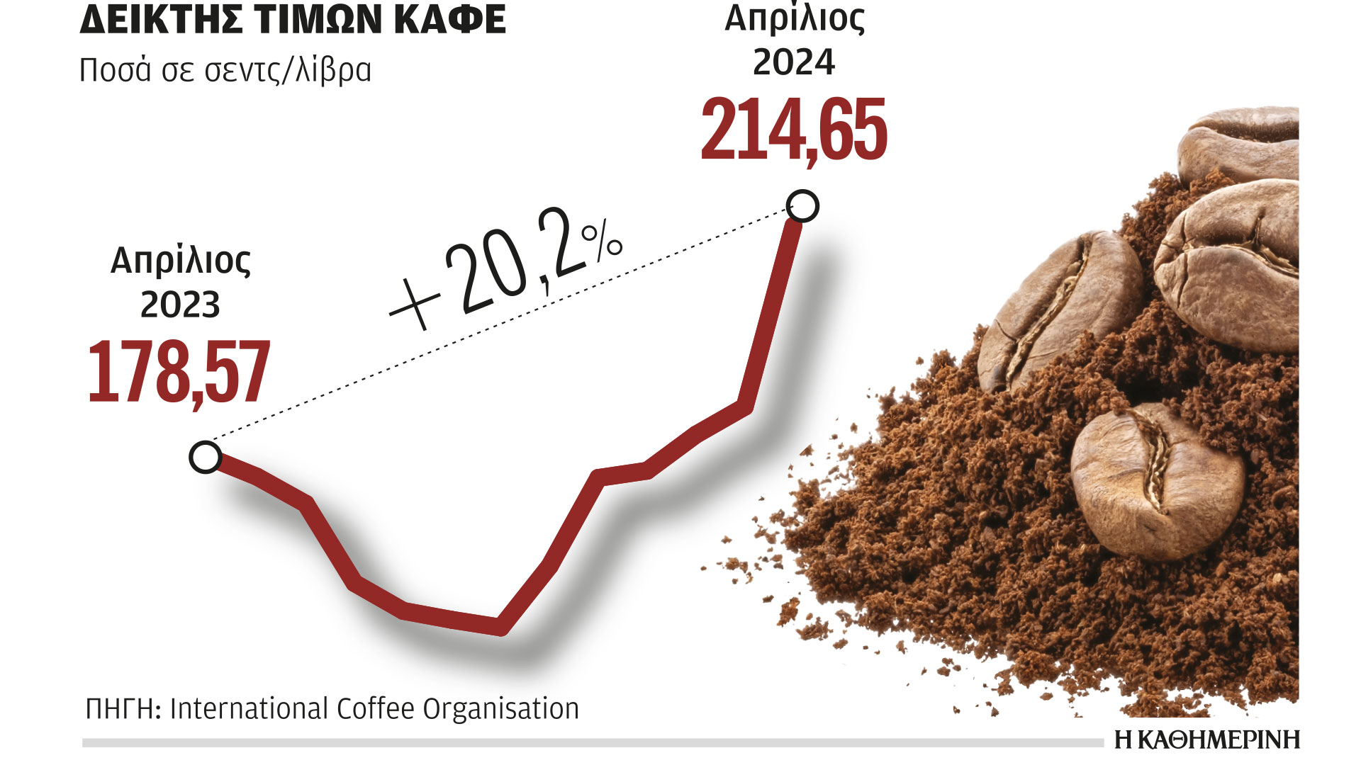 «Πικρός» καφές μας περιμένει μετά το Πάσχα, καθώς αναμένονται αυξήσεις που μπορεί να φτάσουν ακόμη και το 20% μετά το ράλι στις διεθνείς τιμές που παρατηρείται στο προϊόν τους 3-4 τελευταίους μήνες, απόρροια συνδυασμού παραγόντων.
