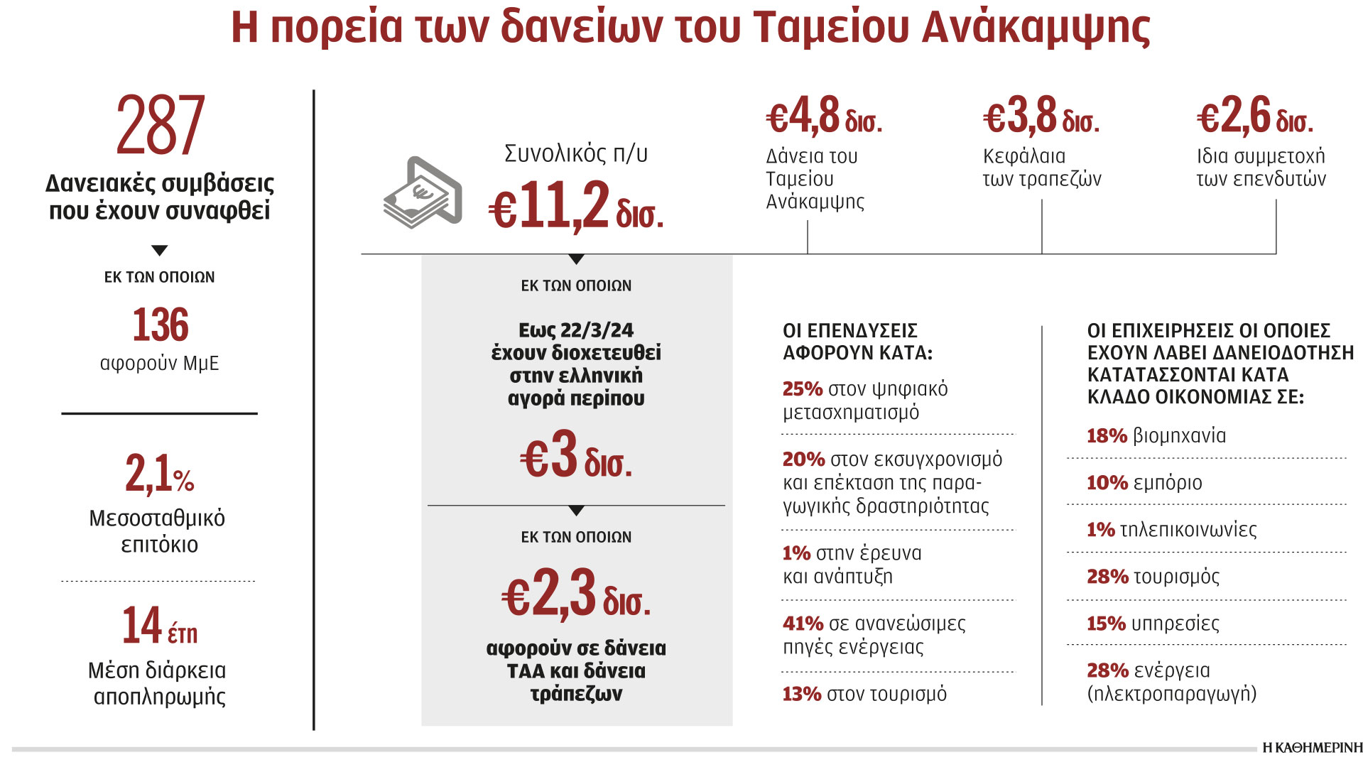Υπενθυμίζεται ότι στο πρόγραμμα των χαμηλότοκων δανείων του Ταμείου Ανάκαμψης ύψους 16,7 δισ. ευρώ, τα επενδυτικά σχέδια είναι επιλέξιμα για δανειοδότηση εφόσον εντάσσονται σε τουλάχιστον έναν από τους 5 πυλώνες του προγράμματος: (α) πράσινη μετάβαση, (β) ψηφιακός μετασχηματισμός, (γ) καινοτομία, έρευνα και ανάπτυξη, (δ) ανάπτυξη οικονομιών κλίμακας μέσω συνεργασιών, εξαγορών και συγχωνεύσεων και (ε) εξωστρέφεια.