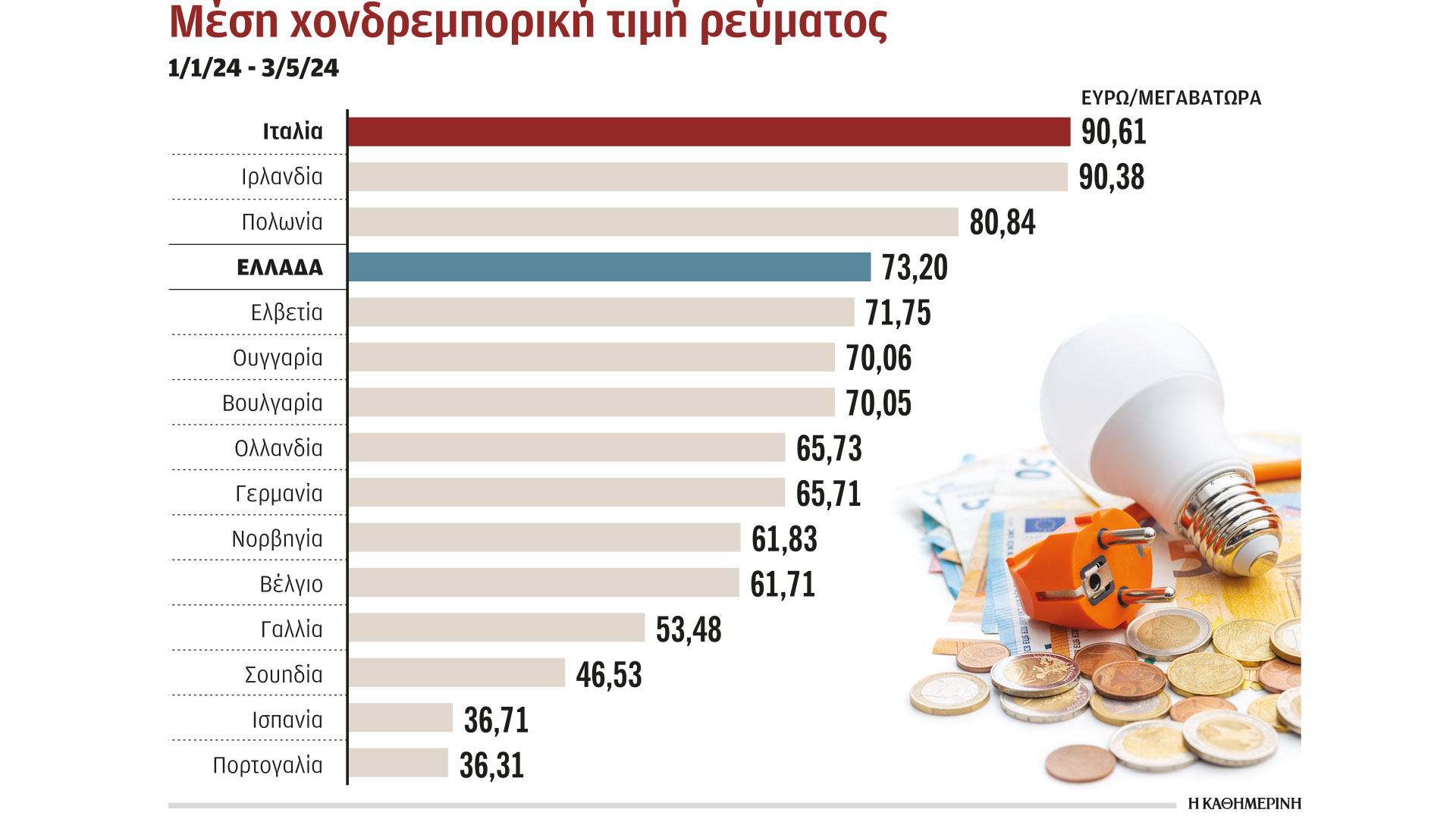 Η εικόνα σε σχέση με τη θέση της ελληνικής αγοράς στον ευρωπαϊκό χάρτη δεν φαίνεται να διαφοροποιείται το 2024. Με την τιμή της μεγαβατώρας από την αρχή του έτους μέχρι και σήμερα (3 Μαΐου) στα 73,20 ευρώ η Ελλάδα εξακολουθεί να αποτελεί την τέταρτη ακριβότερη αγορά της Ευρώπης. Την πρώτη θέση κατέχει σταθερά η Ιταλία με τιμή μεγαβατώρας στα 90,61 ευρώ και ακολουθεί η Ιρλανδία (90,38 ευρώ) και η Πολωνία (80,84 ευρώ). Μεγάλη απόσταση χωρίζει την ελληνική αγορά από τη Γερμανία (65,71 ευρώ/MWh), τη Γαλλία (53,48 ευρώ/MWh) και ακόμη μεγαλύτερη από την Ισπανία και την Πορτογαλία, όπου η υψηλή παραγωγή των φωτοβολταϊκών έχει οδηγήσει τις τιμές λίγο πάνω από τα 36 ευρώ/MWh. Στα φωτοβολταϊκά της Ιβηρικής Χερσονήσου οφείλει τις χαμηλές τιμές και η διασυνδεδεμένη αγορά της Γαλλίας, πέραν βεβαίως της φθηνής εγχώριας πυρηνικής παραγωγής της.