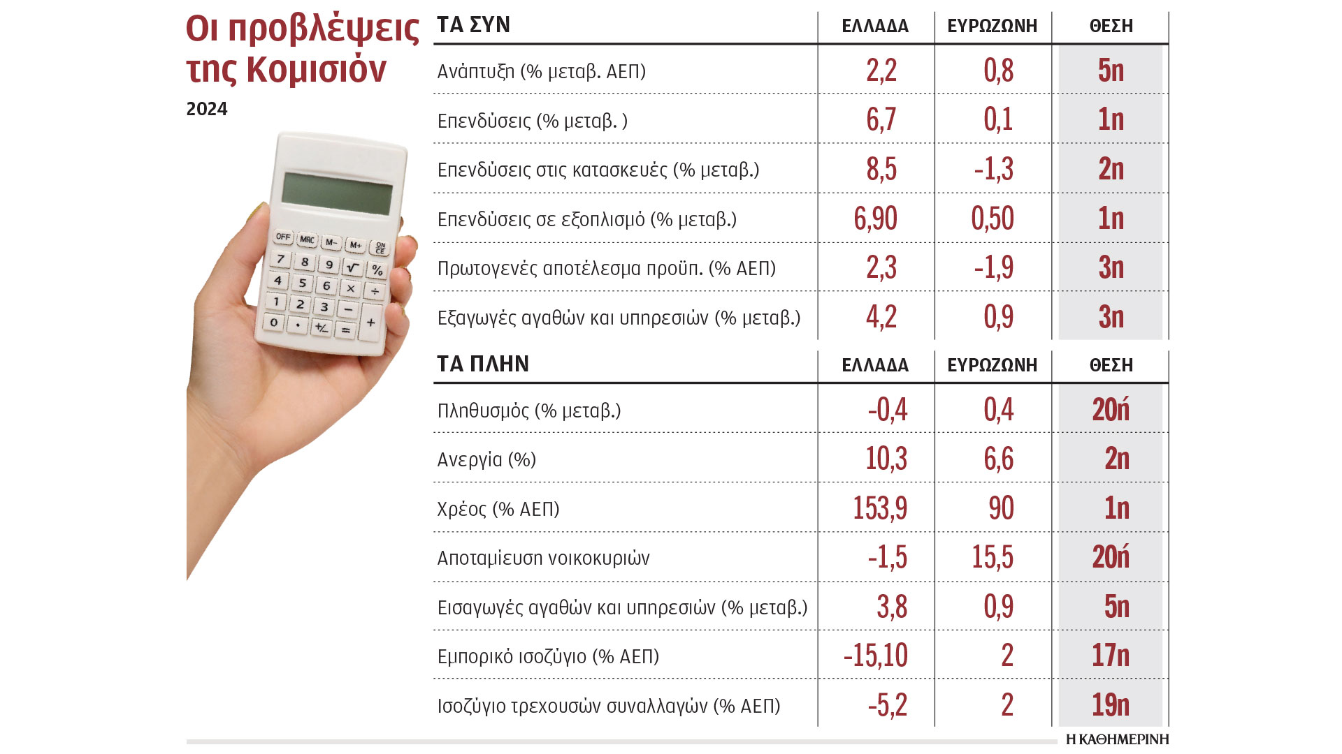 Ο ρυθμός ανάπτυξης της ελληνικής οικονομίας αλλά και η αύξηση των επενδύσεων και των εξαγωγών είναι τα δυνατά, σε σύγκριση με την υπόλοιπη Ευρωζώνη, στοιχεία της στην τρέχουσα συγκυρία, όπως αναδεικνύονται μέσα από τους στατιστικούς πίνακες των εαρινών προβλέψεων της Κομισιόν, που δημοσιεύθηκαν την περασμένη Τετάρτη. Στον αντίποδα, τα αδύνατα στοιχεία, με επιδόσεις που κατατάσσουν την Ελλάδα στις τελευταίες θέσεις και χτυπούν καμπανάκι για το μέλλον, περιλαμβάνουν το έλλειμμα του εμπορικού ισοζυγίου, τις αποταμιεύσεις και φυσικά το δημόσιο χρέος, αλλά και το δημογραφικό.