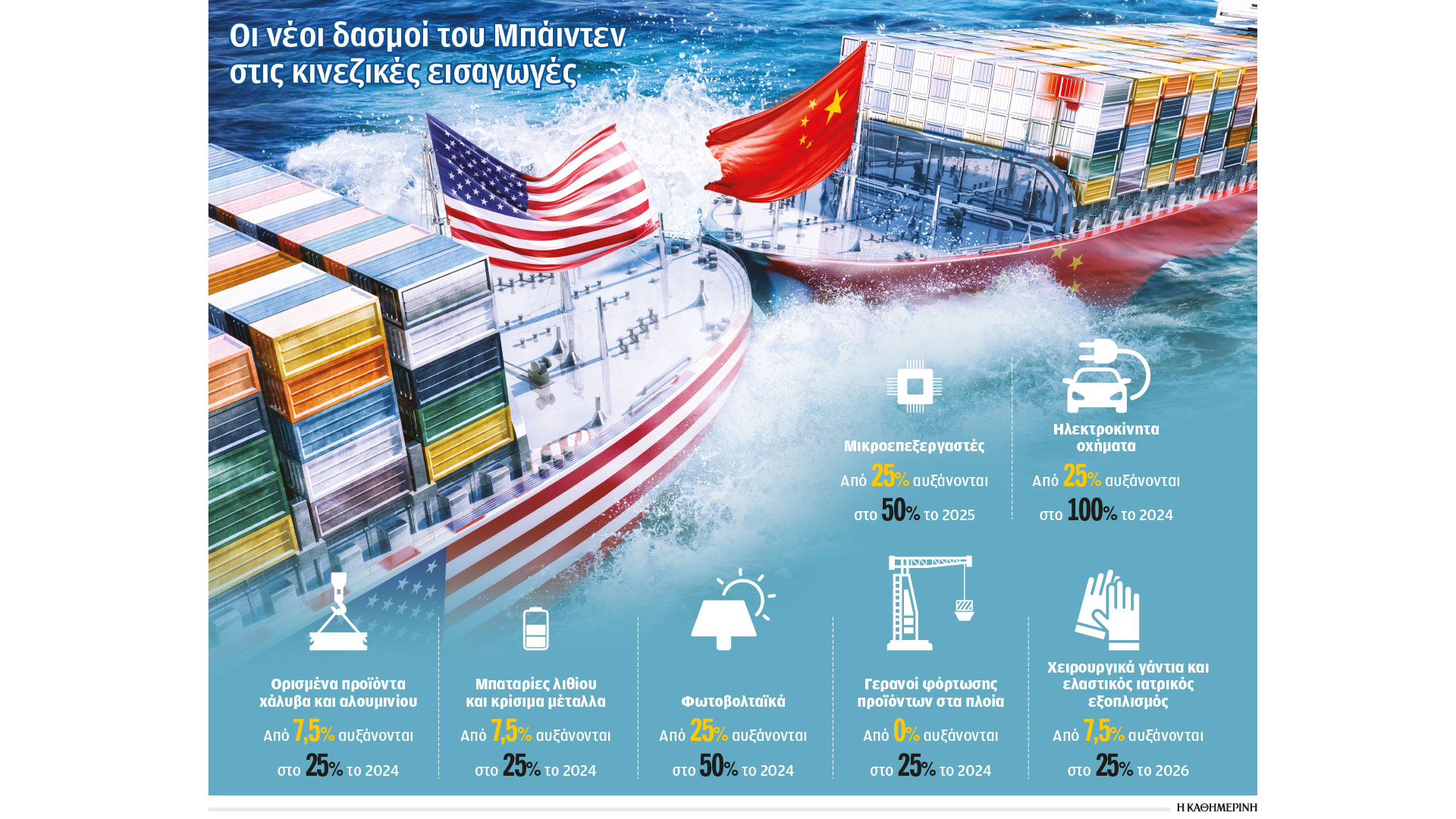 Οι αυξημένοι δασμοί αφορούν πρωτίστως τα ηλεκτροκίνητα οχήματα των κινεζικών βιομηχανικών που απειλούν πράγματι να εκτοπίσουν τα αμερικανικά με τις χαμηλές τιμές τους και είναι εκείνα στα οποία οι δασμοί εκτοξεύονται άμεσα, όπως και οι μπαταρίες λιθίου που τείνουν να αποτελέσουν παγκόσμιο μονοπώλιο της Κίνας. Στις ΗΠΑ επικρατεί πράγματι ανησυχία για το ενδεχόμενο κυριαρχίας των φθηνών ηλεκτροκίνητων οχημάτων, δεδομένου άλλωστε ότι τους τελευταίους μήνες η κινεζική BYD έχει αφήσει πίσω της την Tesla καταγράφοντας περισσότερες πωλήσεις από την καινοτόμο βιομηχανία του Ελον Μασκ.