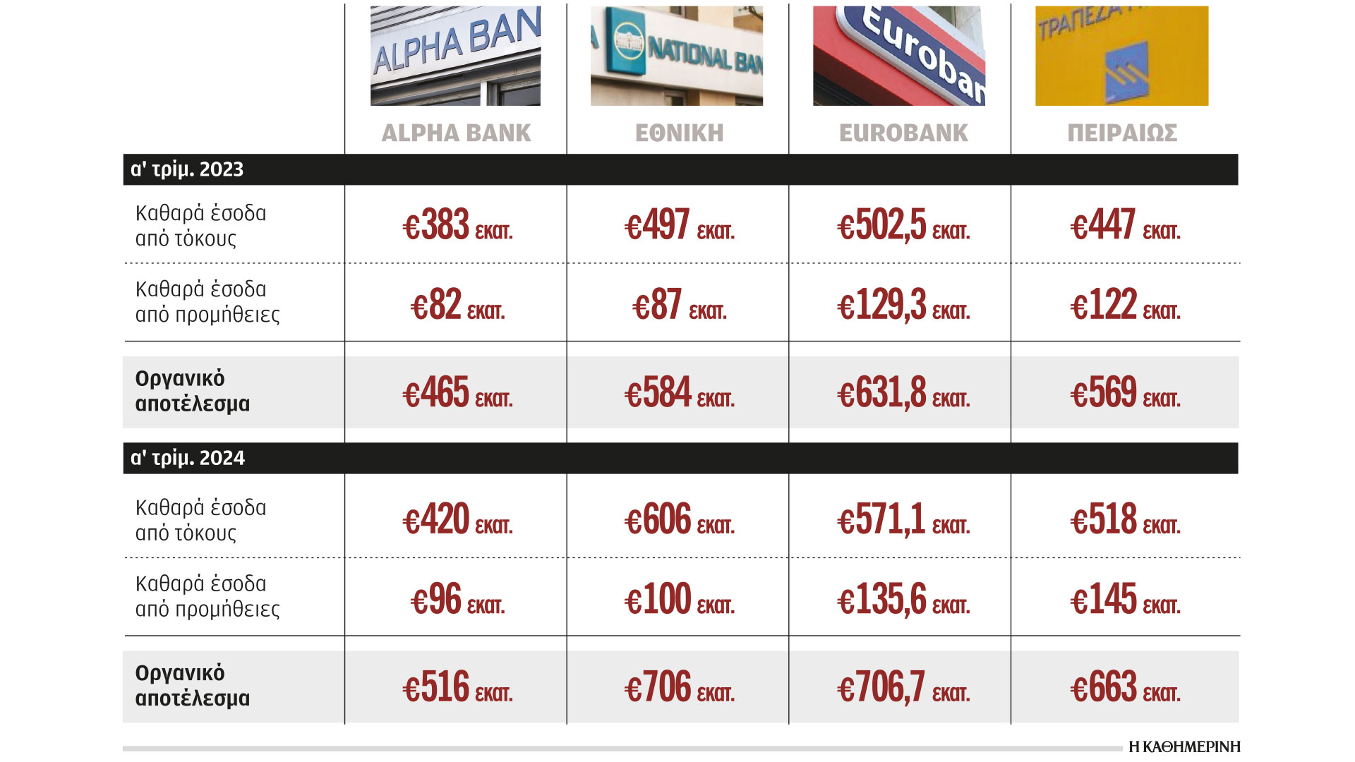 Συρρίκνωση του δανειακού τους χαρτοφυλακίου κατά 100 εκατ. ευρώ στην Ελλάδα καταγράφουν οι τέσσερις συστημικές τράπεζες το α΄ τρίμηνο του έτους σε σχέση με τα τέλη του 2023, καθώς οι εκταμιεύσεις αντισταθμίστηκαν σχεδόν εξ ολοκλήρου από τις αποπληρωμές δανείων, κυρίως από μεγάλες επιχειρήσεις με σημαντικά υπόλοιπα. Σε ετήσια βάση η αύξηση των δανείων ανέρχεται σε 4,2 δισ. ευρώ, τροφοδοτώντας μαζί με την άνοδο των επιτοκίων και τη συγκράτηση των τόκων στις καταθέσεις, την αύξηση στα 2,6 δισ. ευρώ από 2,2 δισ. ευρώ των οργανικών εσόδων, δηλαδή των καθαρών εσόδων από τόκους και προμήθειες την ίδια περίοδο.