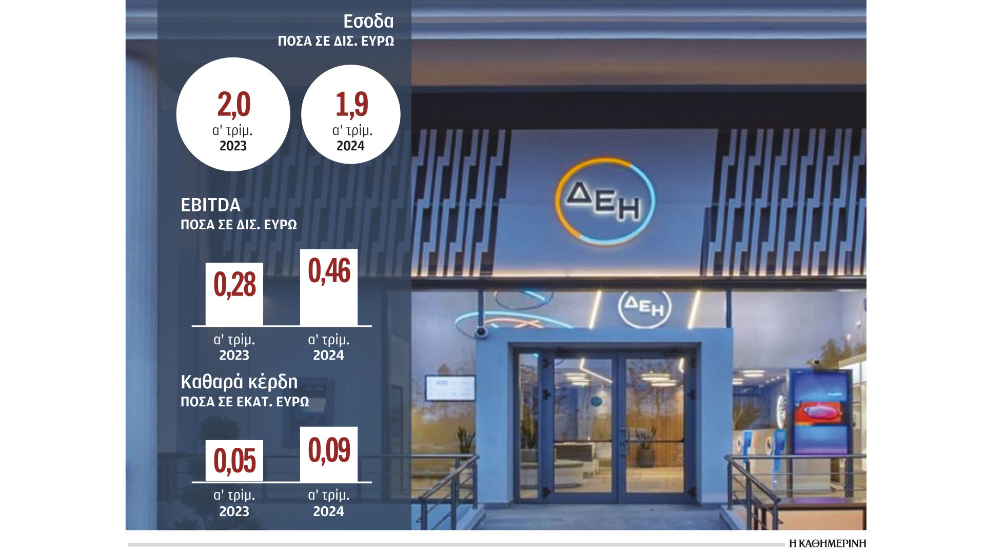 Βελτιωμένη λειτουργική κερδοφορία παρουσίασε η ΔΕΗ το πρώτο τρίμηνο του 2024 με όχημα τη δραστηριότητα της διανομής, τη βελτίωση της δραστηριότητας της παραγωγής και εμπορίας, και την προσθήκη των δραστηριοτήτων στη Ρουμανία. Η εταιρεία ανακοίνωσε χθες ΕΒΙΤDA σε επαναλαμβανόμενη βάση στα 459 εκατ. ευρώ, αυξημένα κατά 64% σε σχέση με το πρώτο τρίμηνο του 2023. Τα κέρδη προ φόρων ανήλθαν σε 122 εκατ. ευρώ, έναντι 73 εκατ. το πρώτο τρίμηνο του 2023, και τα καθαρά κέρδη σε 86 εκατ. ευρώ, έναντι 51 εκατ. το πρώτο τρίμηνο του 2023.