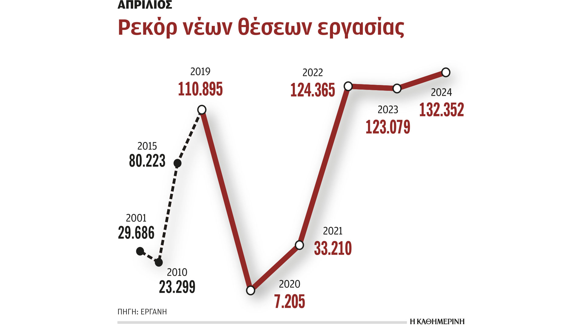 Μεγάλη αύξηση της πλήρους απασχόλησης κατέγραψε τον Απρίλιο το πληροφοριακό σύστημα «Εργάνη» του υπουργείου Εργασίας, με τις προσλήψεις να υπερισχύουν σημαντικά των απολύσεων, ώστε μέσα σε μόνο ένα μήνα να δημιουργηθούν 132.352 νέες θέσεις εργασίας. Πρόκειται για την καλύτερη επίδοση από το 2001 που υπάρχουν στοιχεία, ενώ ρεκόρ αποτελεί και η επίδοση τετραμήνου (Ιανουάριος – Απρίλιος 2024) με 188.587 νέες θέσεις εργασίας.