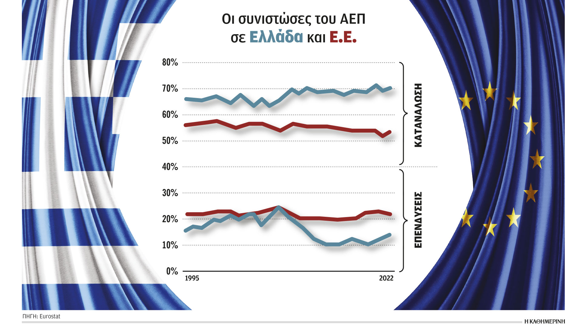 Τα στοιχεία της Eurostat επιβεβαιώνουν την ανισορροπία επενδύσεων – κατανάλωσης στο ελληνικό ΑΕΠ, σε σύγκριση με τον μέσο όρο της Eυρωζώνης: