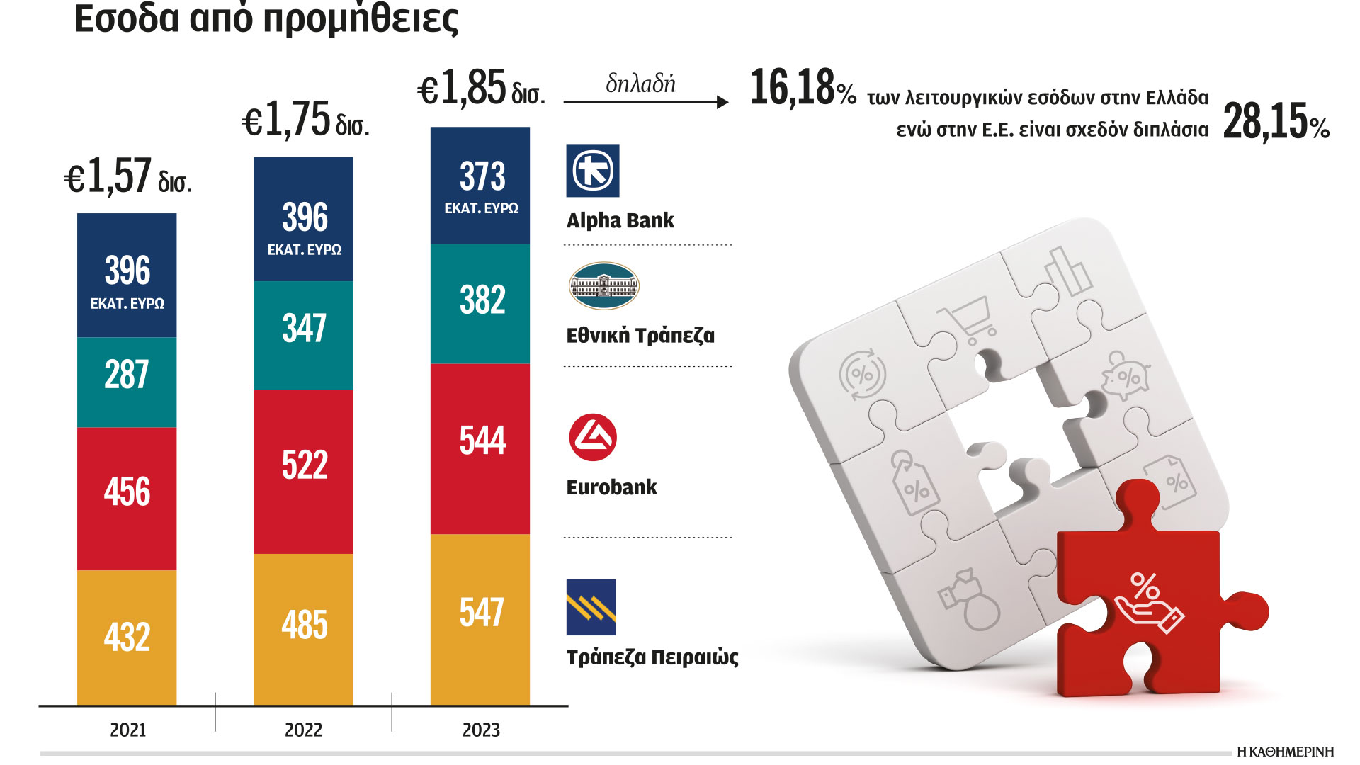 Με συνολικά έσοδα από προμήθειες 382 εκατ. ευρώ το 2023, η Εθνική Τράπεζα άντλησε τα 203 εκατ. ευρώ από τη λιανική τραπεζική, δηλαδή τις συναλλαγές με κάρτες, τις χορηγήσεις προς ιδιώτες και τις πληρωμές, ενώ άλλα 139 εκατ. ευρώ προήλθαν από τις χορηγήσεις επιχειρηματικής πίστης. Ακολουθεί η Alpha Bank με συνολικά έσοδα 373 εκατ. ευρώ το 2023, από τα οποία τα 104 εκατ. ευρώ είναι τα έσοδα από τις συναλλαγές με κάρτες. Συνολικά η λιανική τραπεζική συνεισέφερε έσοδα 134 εκατ. ευρώ, ενώ η επιχειρηματική πίστη συνεισέφερε άλλα 126 εκατ. ευρώ και το wealth management άλλα 83 εκατ. ευρώ.