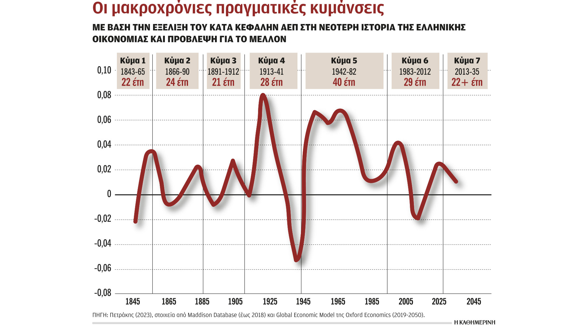 Η ελληνική οικονομία παρουσιάζει άλλη μία κύμανση λόγω της μνημονιακής περιόδου (Διάγραμμα 1), Global Economic Model της Oxford Economics. Οι υπολογισμοί βασίζονται στο κατά κεφαλήν ΑΕΠ, καθώς αυτό αποτελεί τη μοναδική μεταβλητή η οποία μπορεί να παρουσιάσει ιδιαίτερα μακροχρόνια ιστορικότητα για την ελληνική οικονομία μέσω της βάσης Maddison Database. Το διάγραμμα προκύπτει από την ετήσια μεταβολή τού κατά κεφαλήν ΑΕΠ για την ελληνική οικονομία όπως αυτό προκύπτει από τη Maddison Database έως και το 2018 και από το Global Economic Model της Oxford Economics για την περίοδο από το 2019 έως το 2050. Στα στοιχεία αυτά εφαρμόζεται το φίλτρο Hodrick Prescott (L=100) για να εξαλειφθεί και να ομαλοποιηθεί η τάση τού κατά κεφαλήν ΑΕΠ.