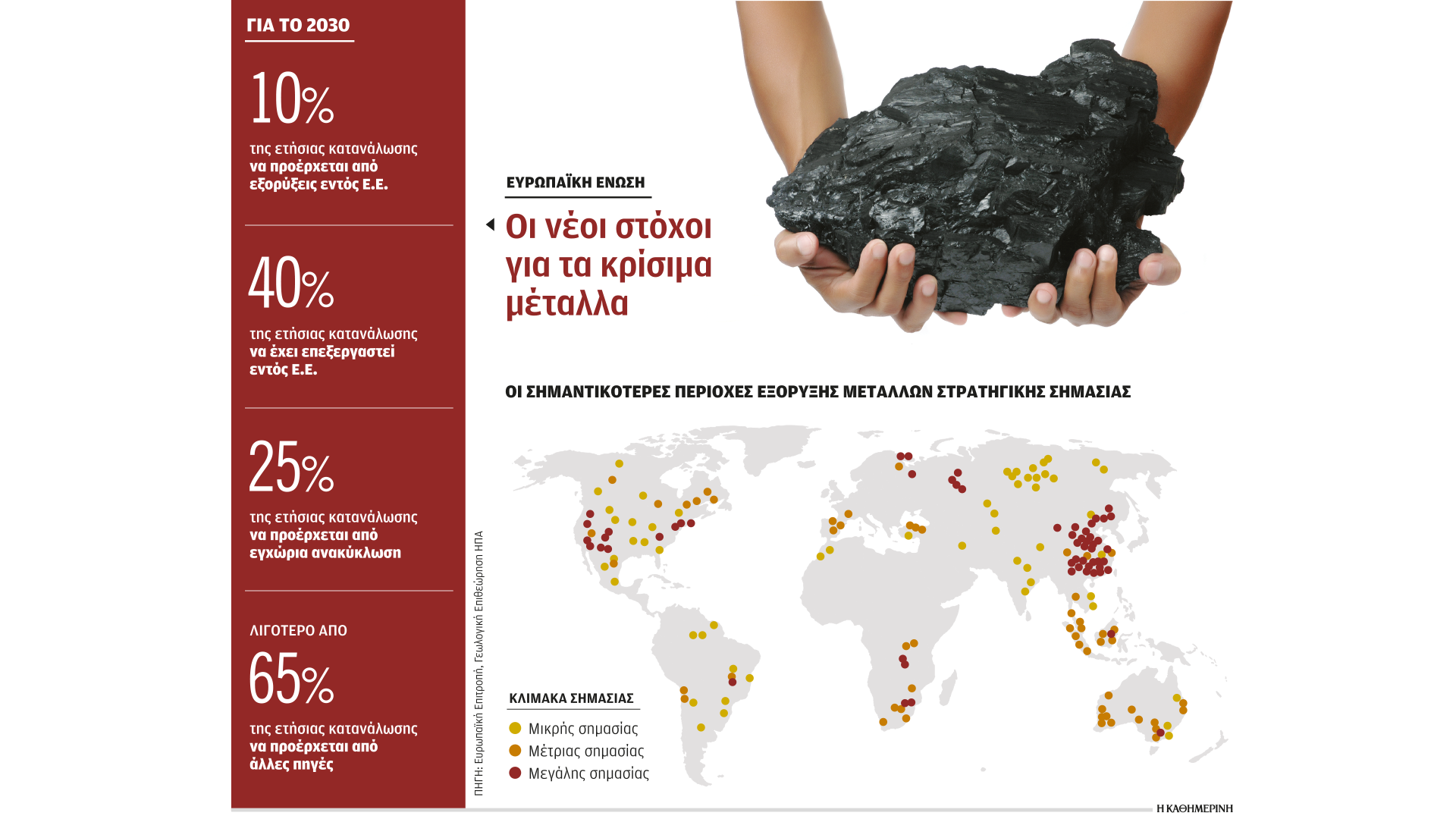 Οταν τον Μάρτιο του 2023 η πρόεδρος της Κομισιόν Ούρσουλα φον ντερ Λάιεν παρουσίασε τη νομοθετική Πράξη της Ε.Ε. για τα Στρατηγικής Σημασίας Μέταλλα και τις Πρώτες Υλες, τόνισε πως μια αξιόπιστη ευρωπαϊκή βάση για τα στρατηγικής σημασίας μέταλλα είναι «ζωτική για την παραγωγή των καίριων τεχνολογιών της πράσινης μετάβασης, όπως η αιολική ενέργεια, η αποθήκευση υδρογόνου ή η κατασκευή μπαταριών». Με τη φράση αυτή συμπύκνωνε ένα καίριο ζητούμενο της Ε.Ε., την απεξάρτησή της ή τουλάχιστον τη μείωση της εξάρτησης από την Κίνα και το σχεδόν παγκόσμιο μονοπώλιο που αυτή κατέχει στην παραγωγή και επεξεργασία των κρισιμότερων μετάλλων, όσων δηλαδή είναι αναγκαία για τη μετάβαση στην πράσινη οικονομία.