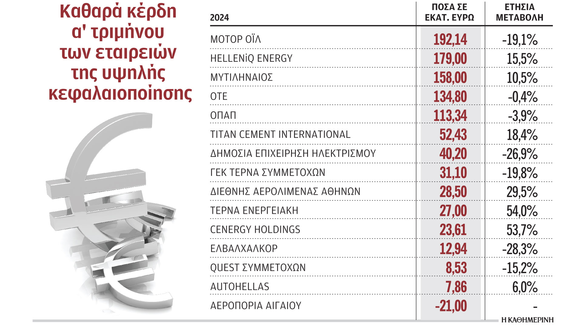 Πολύ θετικά είναι τα μηνύματα που στέλνουν τα αποτελέσματα πρώτου τριμήνου των εισηγμένων εταιρειών υψηλής κεφαλαιοποίησης του Χρηματιστηρίου Αθηνών, με τα συγκεντρωτικά στοιχεία να δείχνουν ότι το 2024 οδεύει στο να αποτελέσει άλλη μία πολύ καλή χρήση, «κοντράροντας» το ρεκόρ του 2023. Ειδικότερα, σύμφωνα με τις ανακοινώσεις των εισηγμένων μη χρηματοοικονομικών εταιρειών στον δείκτη υψηλής κεφαλαιοποίησης FTSE-25 που έχουν έως τώρα δημοσιεύσει στοιχεία πρώτου τριμήνου, τα καθαρά κέρδη διαμορφώνονται κοντά σε αυτά του αντίστοιχου διαστήματος του 2023, και στα 987 εκατ. ευρώ, έναντι 1 δισ. ευρώ (-1,5%).