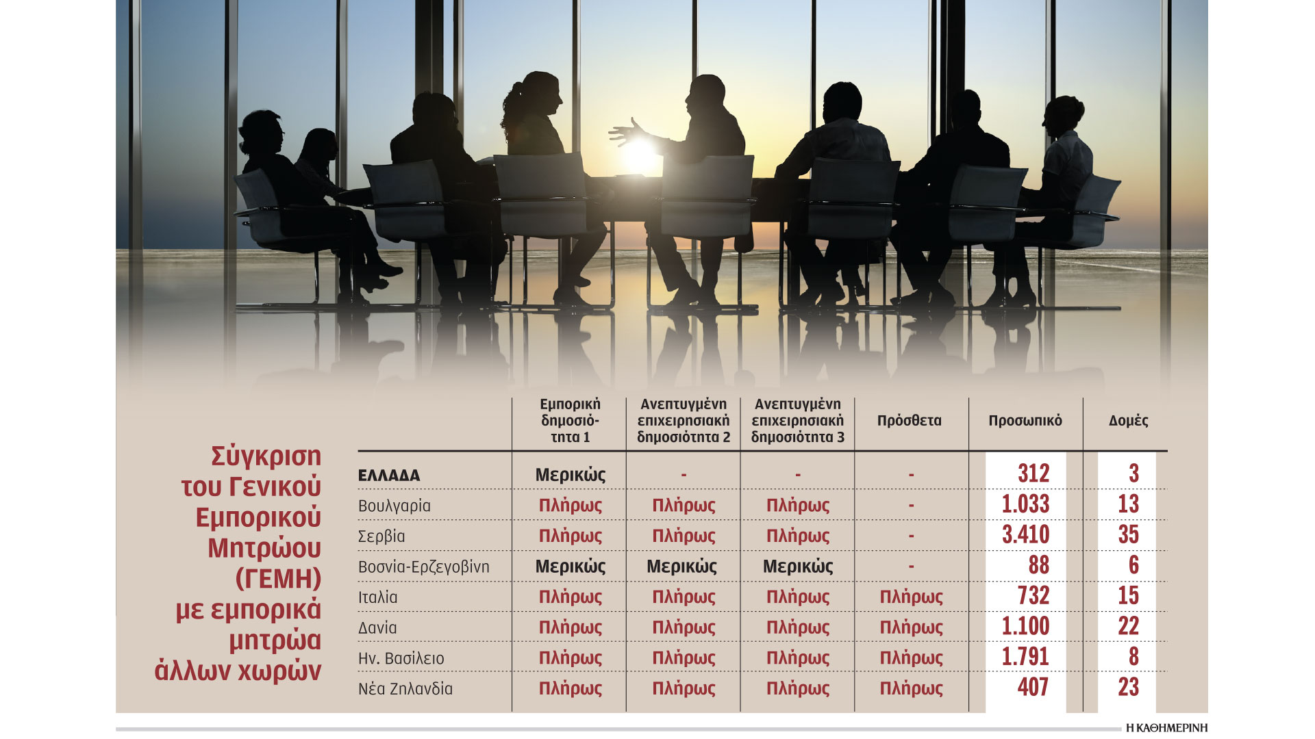 Τι συμβαίνει με άλλα εμπορικά μητρώα και μάλιστα όχι μόνο των πολύ ανεπτυγμένων βορειοευρωπαϊκών χωρών, αλλά και αυτών που βρίσκονται στη γειτονιά μας, όπως για παράδειγμα στη Βουλγαρία, στη Σερβία ή ακόμη και στη Βοσνία – Ερζεγοβίνη; Εκεί μπορεί να βρει κάποιος το μετοχολόγιο των εταιρειών, πληροφορίες για τα ενέχυρα και τις εγγυήσεις, ενώ στην ίδια βάση βρίσκεται το κτηματολόγιο για να γνωρίζει ο επιχειρηματίας τις εμπορικές χρήσεις ή δίνεται η δυνατότητα από την ίδια πλατφόρμα να ανοίγει η επιχείρηση τραπεζικό λογαριασμό και να πληρώνει τους φόρους της.