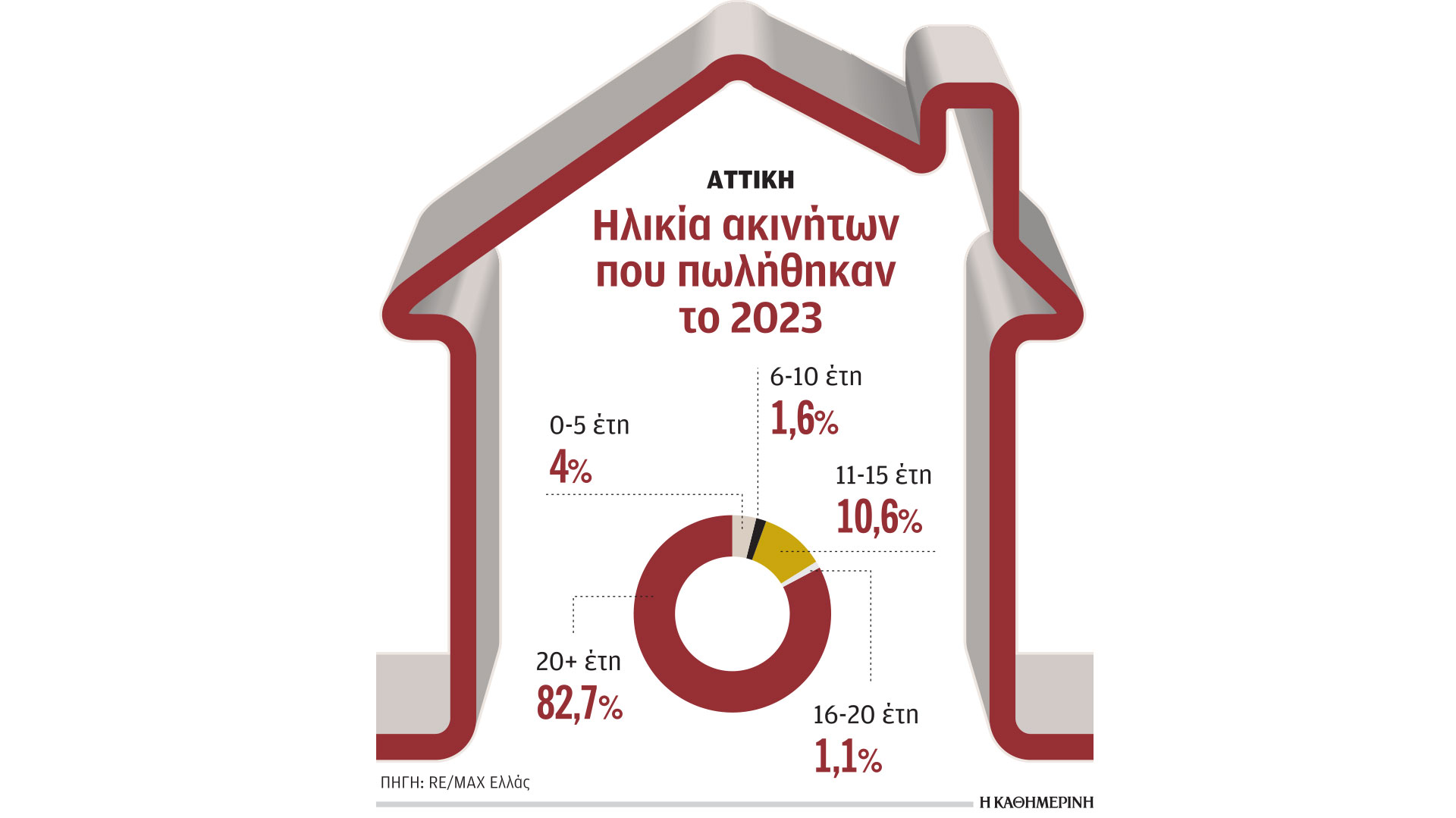 Παγιωμένη είναι στην ελληνική αγορά κατοικίας η τάση της προτίμησης για παλαιότερα ακίνητα ηλικίας άνω των 20 ετών, που είναι και πιο προσιτά ως προς τις τιμές πώλησής τους. Σύμφωνα με τα στοιχεία της τελευταίας ετήσιας έρευνας που πραγματοποίησε το δίκτυο μεσιτικών γραφείων που αριθμεί 85, της RE/MAX Ελλάς, κατά τη διάρκεια του 2023 το 70% των αγοραστών προτίμησε ακίνητα ηλικίας άνω των 20 ετών. Ακόμη ένας λόγος που στρέφει τους ενδιαφερομένους προς αυτά τα ακίνητα είναι το γεγονός ότι μπορούν να μεταπωληθούν σε υψηλότερα επίπεδα, εφόσον ανακαινιστούν και αναβαθμιστούν ενεργειακά.