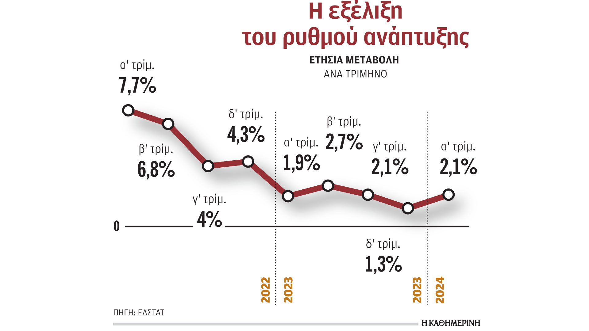 Yψηλότερος από ό,τι αναμενόταν από την αγορά ήταν ο ρυθμός ανάπτυξης του α΄ τριμήνου, καθώς διαμορφώθηκε στο 2,1%, χαρίζοντας χαμόγελα αισιοδοξίας στην κυβέρνηση, καθώς μάλιστα ο αντίστοιχος ρυθμός στην Ευρωπαϊκή Ενωση ήταν ένα ισχνό 0,4%.