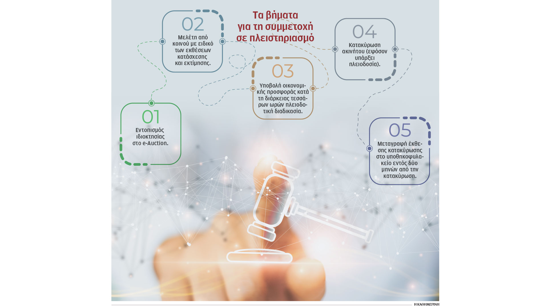 Πώς όμως μπορεί κάποιος να αποκτήσει μία ιδιοκτησία μέσω του κόμβου διενέργειας ηλεκτρονικών πλειστηριασμών e-auction; Αφότου οι ενδιαφερόμενοι επιλέξουν το ακίνητο που πληροί τα επιθυμητά κριτήρια ως προς την τοποθεσία, την τιμή και την επιφάνεια και μελετήσουν σε βάθος τις –αναρτημένες στο e-auction– εκθέσεις κατάσχεσης και εκτίμησης, θα πρέπει να εγγραφούν στην ηλεκτρονική πλατφόρμα. «Θα πρέπει όμως να γνωρίζουν ότι δεν είναι δυνατό να επισκεφθούν το εσωτερικό του ακινήτου, το οποίο μπορούν να δουν μόνο εξωτερικά. Μέχρι και το 2018, οπότε καταργήθηκε η σχετική διάταξη διότι ήταν πρακτικά ανεφάρμοστη, προβλεπόταν η μετάβαση του δικαστικού επιμελητή στο ακίνητο», εξηγεί ο Μιχάλης Αθανασίου.