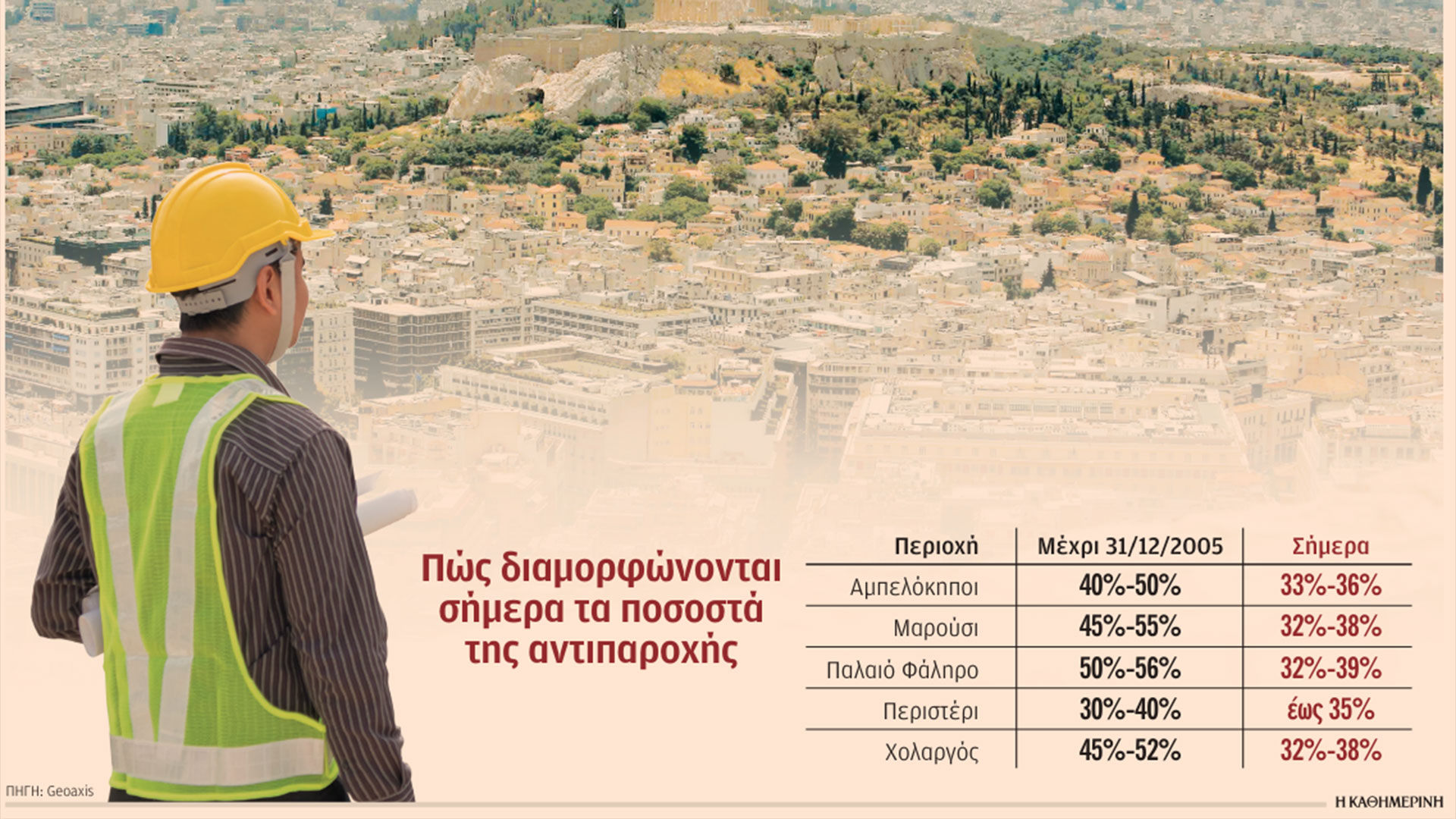 Πάντως, κατά τη διάρκεια του τελευταίου 12μήνου οι αντιπαροχές είχαν παραμείνει σχετικά σταθερές. Με βάση τα στοιχεία της Geoaxis, το μεγαλύτερο ποσοστό εξασφάλιζαν οικοπεδούχοι στο Π. Φάληρο (έως 39%), ενώ στο Μαρούσι και τον Χολαργό το σχετικό ποσοστό ανέρχεται έως 38%. Σύμφωνα πάντως με τον Γιάννη Ξυλά, ιδρυτή και διευθύνοντα σύμβουλο της Geoaxis, «η διαπραγμάτευση μεταξύ εργολάβων και ιδιοκτητών γης γίνεται όλο και σκληρότερη, καθώς η αύξηση των τιμών πώλησης διαμερισμάτων αντισταθμίζεται από την αύξηση του κόστους κατασκευής και χρηματοδότησης.