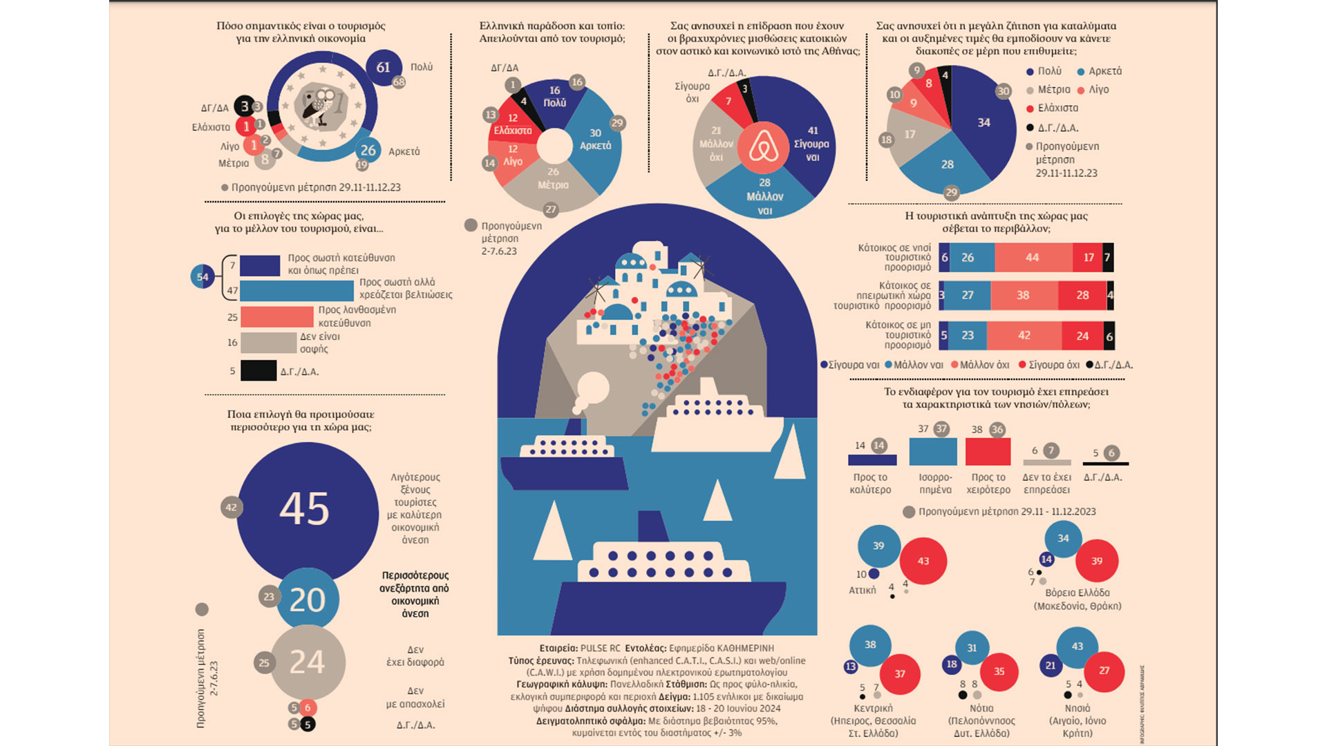 Kαθολική σχεδόν μεταξύ των Ελλήνων πολιτών είναι η αναγνώριση της σημασίας του τουρισμού για την ελληνική οικονομία. Ωστόσο, καθώς οι ξένοι επισκέπτες αυξάνονται και ένα μεγάλο μέρος της επενδυτικής δραστηριότητας εστιάζεται στον κλάδο, είτε σε νέα ξενοδοχεία και σε νέες παραθεριστικές κατοικίες είτε σε συγκροτήματα για βραχυχρόνιες μισθώσεις, αυξάνονται και οι ανησυχίες τόσο για τις επιπτώσεις στο περιβάλλον, όσο και για τις συνέπειες στον χαρακτήρα των προορισμών. Επιπλέον, εντείνεται και η ανησυχία ότι οι διακοπές γίνονται ολοένα και πιο απρόσιτες για τους Ελληνες. Αυτά είναι μερικά από τα βασικά ευρήματα της τρίτης μεγάλης πανελλαδικής έρευνας που διενεργήθηκε από την Pulse για λογαριασμό της πρωτοβουλίας της «Καθημερινής», Reimagine Tourism in Greece. Η πρωτοβουλία Reimagine Tourism ξεκίνησε τη δράση της επίσημα πέρυσι και θα πραγματοποιήσει μεγάλη παρουσίαση φέτος τον Οκτώβριο, καθώς αποσκοπεί στην ενίσχυση του διαλόγου μεταξύ όλων των εμπλεκόμενων πλευρών, πολιτείας, τοπικών κοινωνιών και επιχειρήσεων, με στόχο την ανάδειξη ενός νέου υποδείγματος για τον τουρισμό, το οποίο θα ενισχύσει τα οικονομικά οφέλη για τη χώρα, προφυλάσσοντας όμως παράλληλα το περιβάλλον αλλά και τον χαρακτήρα των προορισμών της.