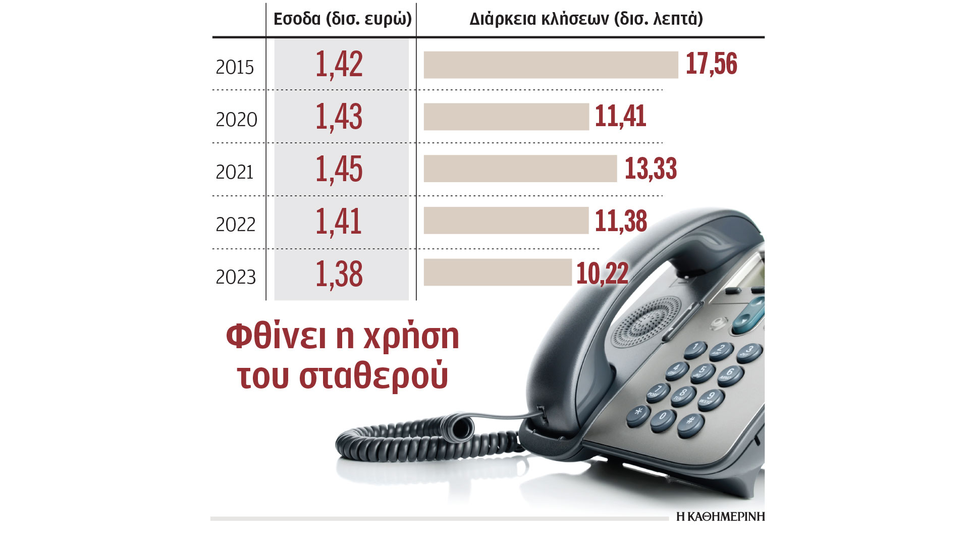 Το 2023, βάσει των τελευταίων διαθέσιμων στοιχείων της ανεξάρτητης αρχής, τα συνολικά έσοδα από την παροχή σταθερής τηλεφωνίας και Ιντερνετ υποχώρησαν κατά 28,2 εκατ. ευρώ, σε 1,38 δισ. ευρώ από 1,41 δισ. το 2022. Σε σχέση με το 2015 μειώθηκαν κατά περίπου 2,5%, με τη διείσδυση των –συνολικά περίπου 5 εκατ.– γραμμών σταθερής τηλεφωνίας να είναι περίπου 45%-46%. Τη μείωση της χρήσης του σταθερού, που διατίθεται ως τμήμα συνδυαστικού «πακέτου» τηλεφωνίας και Ιντερνετ (double play) και συνδρομητικής τηλεόρασης (triple play), επιβεβαιώνει και η διάρκεια των τηλεφωνικών κλήσεων, που υποχωρεί συνεχώς. Πέρυσι για πρώτη φορά, η συνολική διάρκεια κλήσεων βρέθηκε κοντά στο «ψυχολογικό όριο» των 10 δισ. λεπτών. Διαμορφώθηκε δηλαδή σε 10,2 δισ. ή 170 εκατ. ώρες, έχοντας υποχωρήσει κατά περίπου 10% συγκριτικά με το 2022. Εάν συγκριθεί με το 2015, η διάρκεια των κλήσεων προς σταθερά πέρυσι υποχώρησε κατά περίπου 42%. Επίσης, η διάρκεια των αστικών και υπεραστικών κλήσεων διαμορφώθηκε το 2023 σε 7,8 δισ. λεπτά ή 130,2 εκατ. ώρες, έχοντας μειωθεί κατά 11,3% σε ετήσια βάση σύγκρισης.