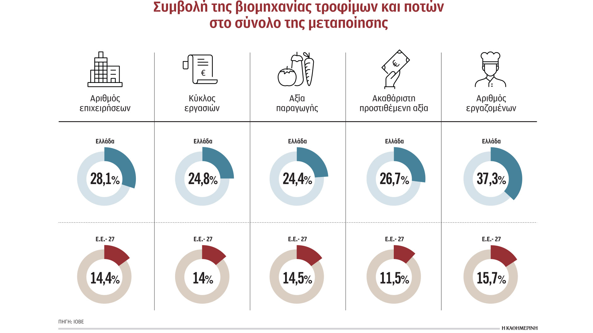 Εχοντας επιδείξει ισχυρή ανθεκτικότητα ακόμη και σε περιόδους βαθιάς οικονομικής κρίσης, η βιομηχανία τροφίμων και ποτών εξακολουθεί να αποτελεί τον μεγαλύτερο κλάδο της εγχώριας μεταποίησης, γεγονός που δεν αποτυπώνεται μόνο στον αριθμό των επιχειρήσεων και των εργαζομένων, αλλά και στην ακαθάριστη προστιθέμενη αξία των συγκεκριμένων βιομηχανιών στο σύνολο της ελληνικής μεταποίησης. Την ίδια στιγμή, μολονότι οι δαπάνες των ελληνικών επιχειρήσεων σε έρευνα και ανάπτυξη –κλάδος «κλειδί» για την ενίσχυση της καινοτομίας– υπολείπονται σε σύγκριση με τον ευρωπαϊκό μέσο όρο, οι βιομηχανίες τροφίμων και ποτών πρωτοστατούν σε επενδύσεις στον συγκεκριμένο τομέα.