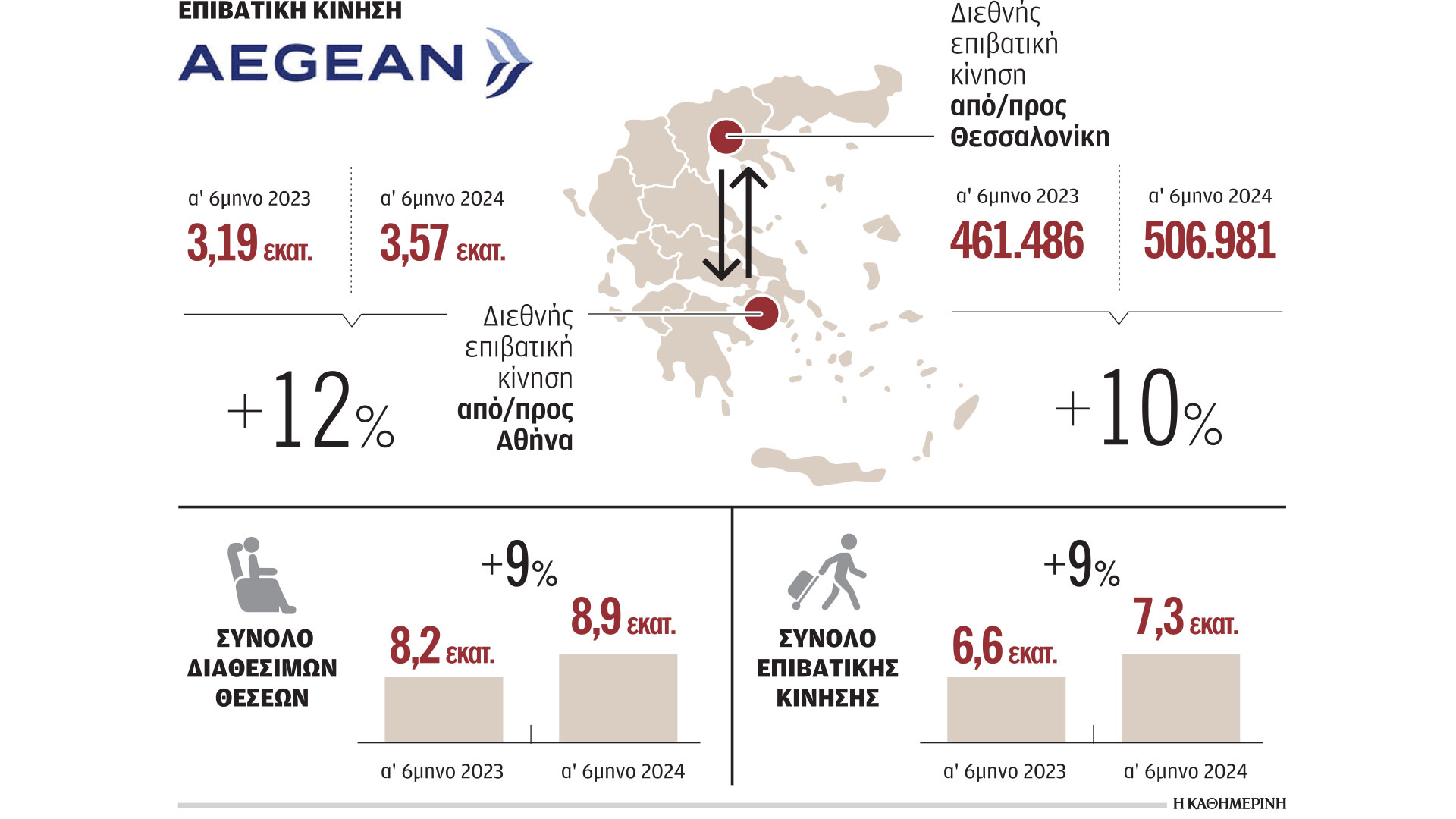 Νέο ρεκόρ μεγεθών για το 2024 προμηνύουν τα μεγέθη επιβατικής κίνησης της Aegean κατά το δεύτερο τρίμηνο και από τον Ιανουάριο έως και τον Ιούνιο της φετινής χρονιάς. Ειδικότερα, κατά το δεύτερο τρίμηνο της χρονιάς η αεροπορική μετέφερε 4,4 εκατ. επιβάτες, αριθμός που είναι αυξημένος κατά 8% σε ετήσια βάση σύγκρισης. Το πρώτο εξάμηνο της χρονιάς, που περιλαμβάνει το παραδοσιακά ασθενές πρώτο τρίμηνο, η Aegean ενίσχυσε κατά 9%, σε 7,3 εκατ. άτομα, την επιβατική κίνηση, συγκριτικά με το αντίστοιχο διάστημα του 2023.