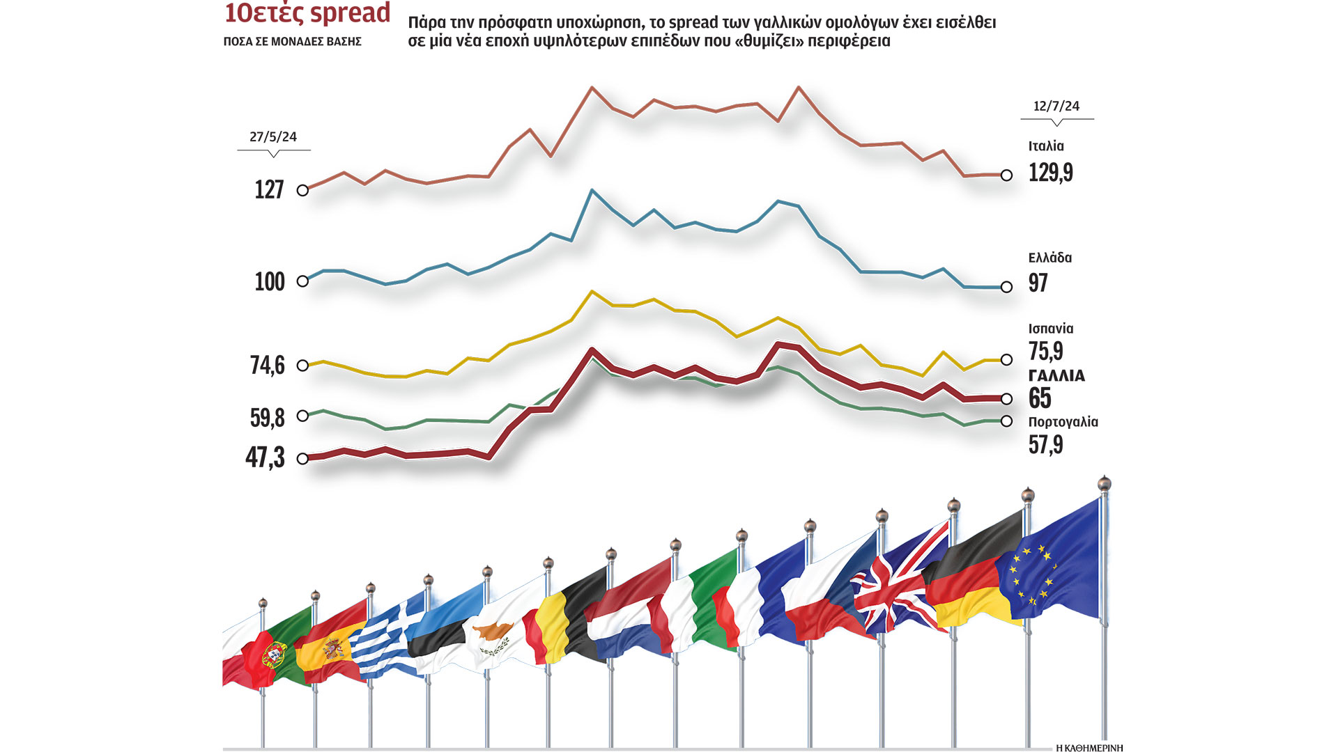 Το spread των 10ετών γαλλικών ομολόγων εκτινάχθηκε πάνω από τις 80 μονάδες βάσης λίγο πριν από τον β΄ γύρο των εκλογών και στο υψηλότερο επίπεδο από την κρίση χρέους της Ευρωζώνης, ενώ στη συνέχεια υποχώρησε στην περιοχή των 65-70 μ.β., αλλά σημαντικά υψηλότερα από τα επίπεδα που ήταν πριν από την προκήρυξη των πρόωρων εκλογών και τις 40 μ.β. Η πολιτική κρίση στην οποία μπήκε η Γαλλία με αιτία και αφορμή τις ευρωεκλογές του Ιουνίου, προκάλεσε αναταράξεις και στα υπόλοιπα ομόλογα της Ευρωζώνης, οδηγώντας τα spreads τους στο υψηλότερο επίπεδο για το έτος. Για παράδειγμα, τα πορτογαλικά spreads έφτασαν έως και τις 74 μ.β., τα ισπανικά τις 97 μ.β., τα ελληνικά τις 124 μ.β. και τα ιταλικά τις 158 μ.β., με μέση αύξηση 20-25 μ.β. σε σχέση με τα επίπεδα πριν από τις ευρωεκλογές. Πλέον έχουν επιστρέψει σε αυτά, αντανακλώντας την πεποίθηση των επενδυτών ότι η γαλλική πολιτική αναταραχή δεν θα εξελιχθεί σε ένα ευρύτερο επεισόδιο κατακερματισμού.