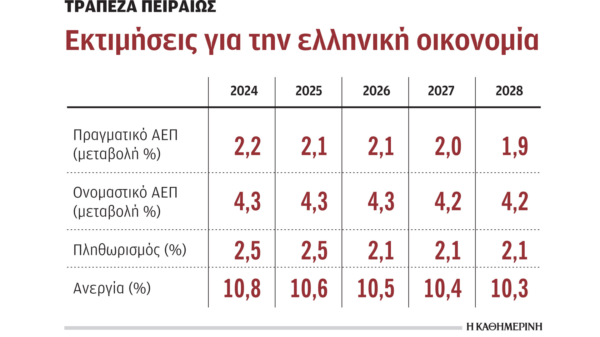 Σε κάθε περίπτωση, καταλήγει η Τράπεζα Πειραιώς, η οικονομική υστέρηση έχει οδηγήσει στην υποβάθμιση των ρυθμών αύξησης του ΑΕΠ, από έναν μέσο ρυθμό 2,5% –τον οποίο η ίδια προέβλεπε ότι θα επιτύγχανε η ελληνική οικονομία (τη δεκαετία 2024 -2033)– σε 2% και του μέσου λόγου επενδύσεων προς ΑΕΠ από 19% σε 17%.