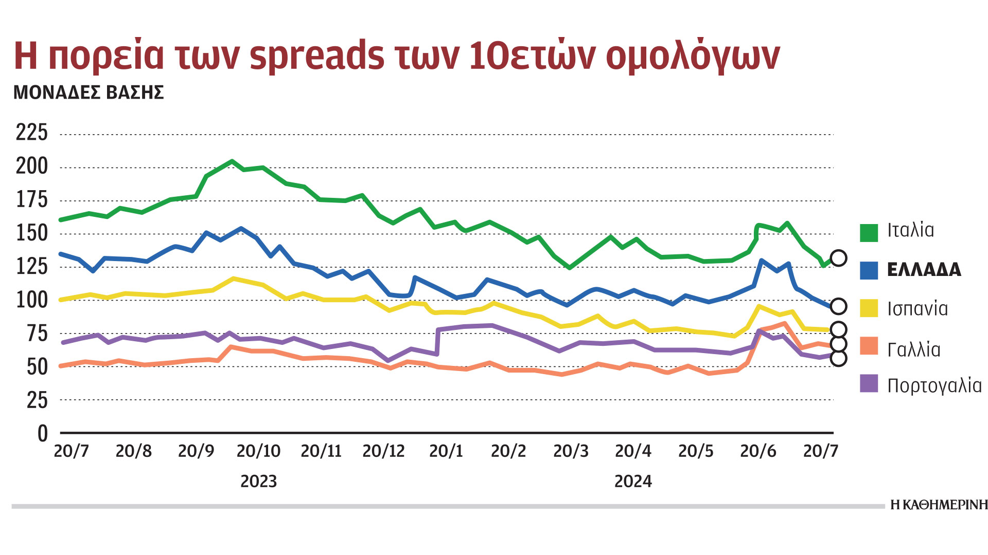 Αντιθέτως, το μήνυμα που στέλνουν τα spreads για τη Γαλλία είναι αυτό μιας ευάλωτης οικονομικά και πολιτικά χώρας, η οποία πληρώνει το τίμημα αυτής της αβεβαιότητας. Ως κομβική δύναμη, η Γαλλία παραδοσιακά πλήρωνε μόνο ένα μέτριο premium σε σχέση με τα γερμανικά ομόλογα. Οι μεταρρυθμίσεις του Μακρόν ενίσχυσαν την εμπιστοσύνη της αγοράς, παρά τον αυξανόμενο δείκτη χρέους της. Αν και η υποστήριξη προς τους φιλομεταρρυθμιστικούς κεντρώους της Γαλλίας δεν κατέρρευσε τόσο άσχημα όσο προβλεπόταν στις πρόσφατες πρόωρες εκλογές (27%), η διαιρεμένη Αριστερά (31%) και η Ακροδεξιά της Λεπέν (25%) θέλουν να αντιστραφούν ορισμένες από τις μεταρρυθμίσεις. Ετσι, η Berenberg αναμένει πλέον σωρευτική ανάπτυξη 3,6% αντί 4,3% στη Γαλλία το 2024-2026, κάτι που θα επιδεινώσει το δημοσιονομικό πρόβλημα και –κρίνοντας από τα θεμελιώδη– το γαλλικό spread (67 μ.β.) δεν θα πρέπει πλέον να είναι χαμηλότερο από αυτό της Ισπανίας.