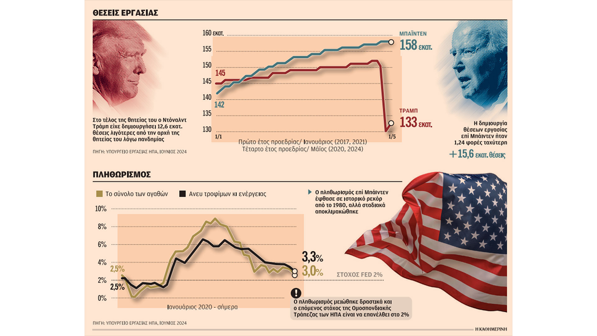 «Η οικονομία μας πηγαίνει κατά διαόλου». «Ο πληθωρισμός είναι καταστροφή». «Θα αφαιρέσω θέσεις εργασίας από την Κίνα και θα της επαναφέρω στο Μίσιγκαν». Αυτές είναι ορισμένες από τις γενικόλογες διακηρύξεις του υποψηφίου των Ρεπουμπλικανών Ντόναλντ Τραμπ για τις προεδρικές εκλογές στις Ηνωμένες Πολιτείες. Αν και επί προεδρίας Τζο Μπάιντεν η οικονομία ακμάζει και η ανεργία υποχωρεί, ο Τραμπ επιμένει ότι στη δική του θητεία η ανάπτυξη, η απασχόληση και ο πληθωρισμός βρίσκονταν σε καλύτερη κατάσταση. Πάντως, στις τωρινές του ομιλίες δεν μιλάει με στοιχεία ούτε αναφέρεται σε νομοθετικά μέτρα, αλλά προετοιμάζεται για την επιβολή δασμών σε εμπορικούς εταίρους, καθώς και την ελαφρά μείωση του συντελεστή εταιρικών κερδών. Καθόλου ευαισθητοποιημένοι για τους κλιματικούς στόχους, οι Ρεπουμπλικανοί συνολικά επιδιώκουν την άντληση περισσότερου πετρελαίου, φυσικού αερίου και γαιάνθρακα. Αλλωστε, ο Τραμπ έχει δηλώσει ευθαρσώς ότι θα καταργήσει τις πράσινες πολιτικές του προκατόχου του για τα ηλεκτρικά οχήματα και τις ΑΠΕ, ενώ θα αντιμετωπίσει την παράτυπη μετανάστευση «με το μεγαλύτερο πρόγραμμα απελάσεων στην Ιστορία». Σε ανάλυση του Ινστιτούτου Πίτερσον για τα Διεθνή Οικονομικά φαίνεται ότι, εάν απελαθούν 1,3 ξένοι εργάτες, το μέγεθος της αμερικανικής οικονομίας θα συρρικνωθεί 2,1%, οδηγώντας την σε ύφεση. Από την πλευρά τους οι Δημοκρατικοί και εξέχοντες οικονομολόγοι, όπως αναφέρει δημοσίευμα του PBS News, επισημαίνουν ότι με απλά μαθηματικά φαίνεται πως οι προτάσεις Τραμπ θα εκτινάξουν τον πληθωρισμό, θα κλονίσουν τη μεσαία τάξη και θα διογκώσουν έτι περαιτέρω το δημόσιο χρέος κατά 5 τρισ. δολάρια και πλέον με το να δοθεί παράταση στις φοροαπαλλαγές της πρώτης θητείας του, που συντόμως λήγουν.
