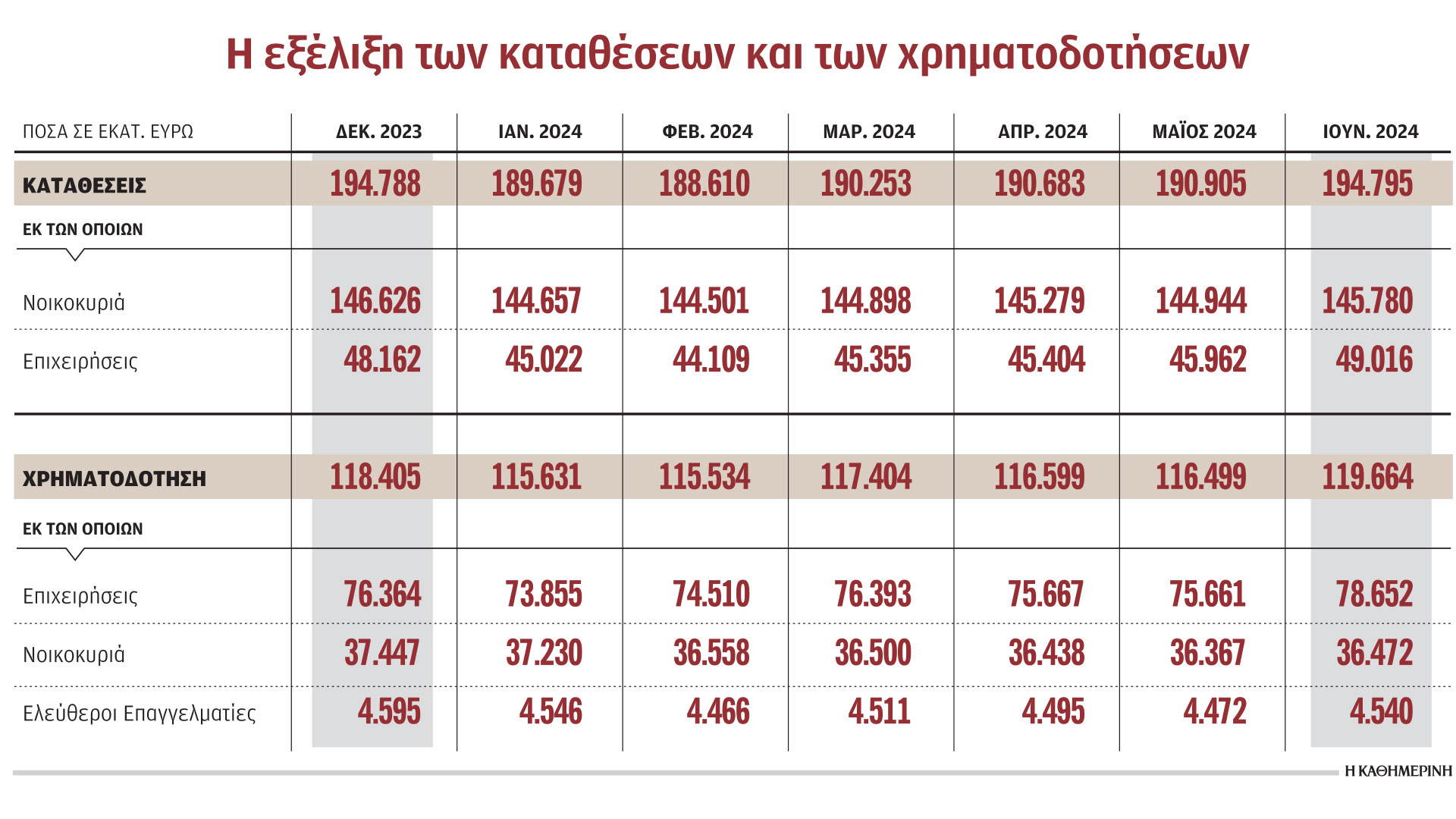 Από την αρχή του χρόνου οι καταθέσεις των νοικοκυριών και των επιχειρήσεων έχουν αυξηθεί κατά 5,1 δισ. ευρώ, το μεγαλύτερο μέρος των οποίων –κοντά στα 4 δισ. ευρώ– προέρχεται από την αύξηση των υπολοίπων που διατηρούν οι επιχειρήσεις στις τράπεζες, οι οποίες από τα 45 δισ. ευρώ εκτινάχθηκαν στα 49 δισ. ευρώ.