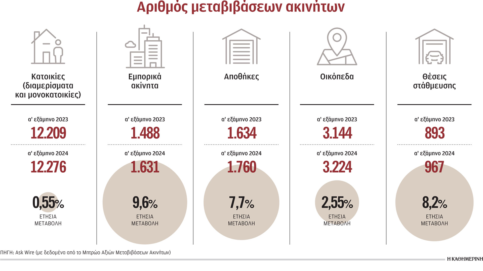 Εκτός από τις κατοικίες, 1.631 εμπορικά ακίνητα μεταβιβάστηκαν κατά το φετινό πρώτο εξάμηνο, έναντι 1.488 το ίδιο περυσινό διάστημα, μια αύξηση κατά 9,6%. Σημαντική αύξηση καταγράφουν επίσης οι μεταβιβάσεις αποθηκών, αλλά και θέσεων στάθμευσης, που έχουν και επενδυτικό χαρακτήρα, καθώς αρκετοί μπορούν να εξασφαλίσουν ένα σημαντικό έσοδο σε μηνιαία βάση. Στο πλαίσιο αυτό, κατά το φετινό πρώτο εξάμηνο μεταβιβάστηκαν 967 θέσεις στάθμευσης, μια αύξηση κατά 8,2% ετησίως. Αντίστοιχα, πουλήθηκαν και 3.224 οικόπεδα, μια αύξηση κατά 2,55% σε σχέση με το αντίστοιχο περυσινό διάστημα.