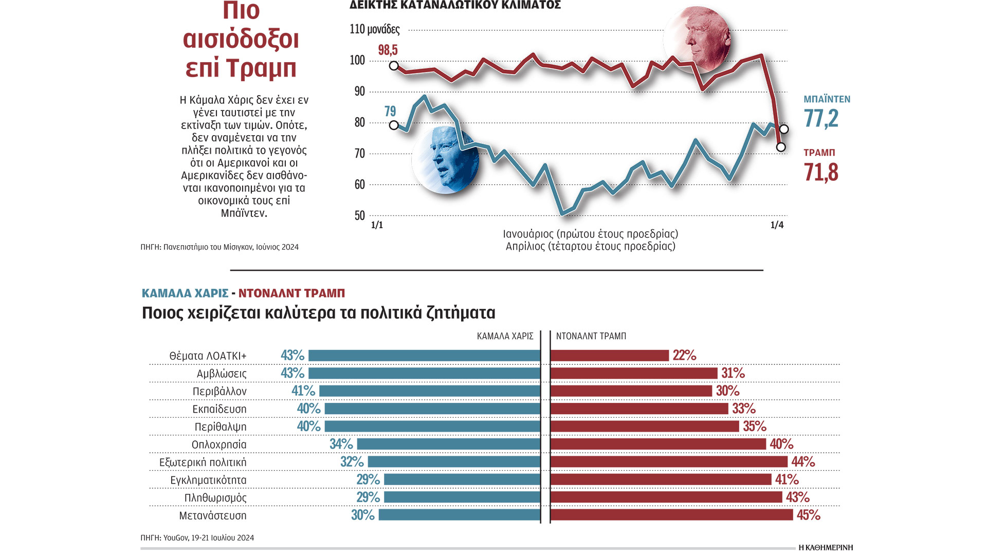 Το πιο άμεσο εμπόδιο για την ίδια θα είναι ίσως να ξεπεράσει τα μελανά σημεία της οικονομικής κληρονομιάς της δικής της κυβέρνησης. Επί Μπάιντεν, ο πληθωρισμός εκτινάχθηκε το 2022 σε υψηλό 40 ετών. Οι επιπτώσεις κυμαίνονταν από την άνοδο των τιμών στο σούπερ μάρκετ, έως τις αυξήσεις επιτοκίων της Fed που δυσκόλεψαν τους Αμερικανούς να λάβουν προσιτά στεγαστικά δάνεια και να αγοράσουν σπίτια. Ο πληθωρισμός έχει μειωθεί πλέον και πολλοί οικονομολόγοι αναμένουν ότι η Fed θα μειώσει τα επιτόκια μέχρι τον Σεπτέμβριο.