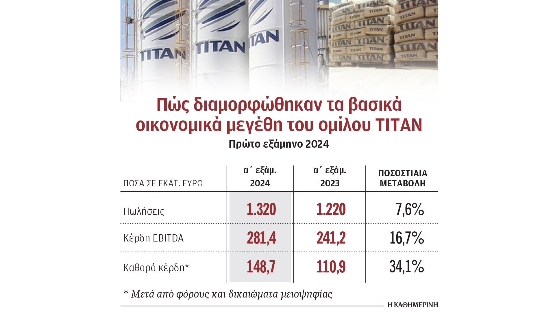 Σε τροχιά υψηλής ανάπτυξης και συνεχούς βελτίωσης των οικονομικών αποτελεσμάτων του έχει εισέλθει ο όμιλος Τιτάν μετά και τη δημοσιοποίηση των αποτελεσμάτων του φετινού πρώτου εξαμήνου, με τη διοίκηση να αναφέρει χθες ότι η ολοκλήρωση μιας σειράς επενδύσεων που έγιναν το προηγούμενο διάστημα θα ενισχύσει ακόμη περισσότερο τα περιθώρια κέρδους και τις πωλήσεις του ομίλου όχι μόνο κατά το δεύτερο εξάμηνο του 2024, αλλά και το 2025. Σημαντικό ρόλο στην εξέλιξη αυτή διαδραματίζει και η στρατηγική αύξησης των τιμών που ακολουθεί ο όμιλος τόσο στην αγορά των ΗΠΑ όσο και σε άλλες, όπως για παράδειγμα της Ελλάδας, όπου ενισχύθηκαν οι τιμές σε προϊόντα όπως τα αδρανή υλικά, το έτοιμο σκυρόδεμα και τα κονιάματα. Παράλληλα, όπως αναφέρθηκε χθες, η εισαγωγή της θυγατρικής του ομίλου στις ΗΠΑ, Titan USA, προχωρεί κανονικά, με τη σχετική διαδικασία να αναμένεται ότι θα έχει ολοκληρωθεί εντός του πρώτου τριμήνου του 2025.