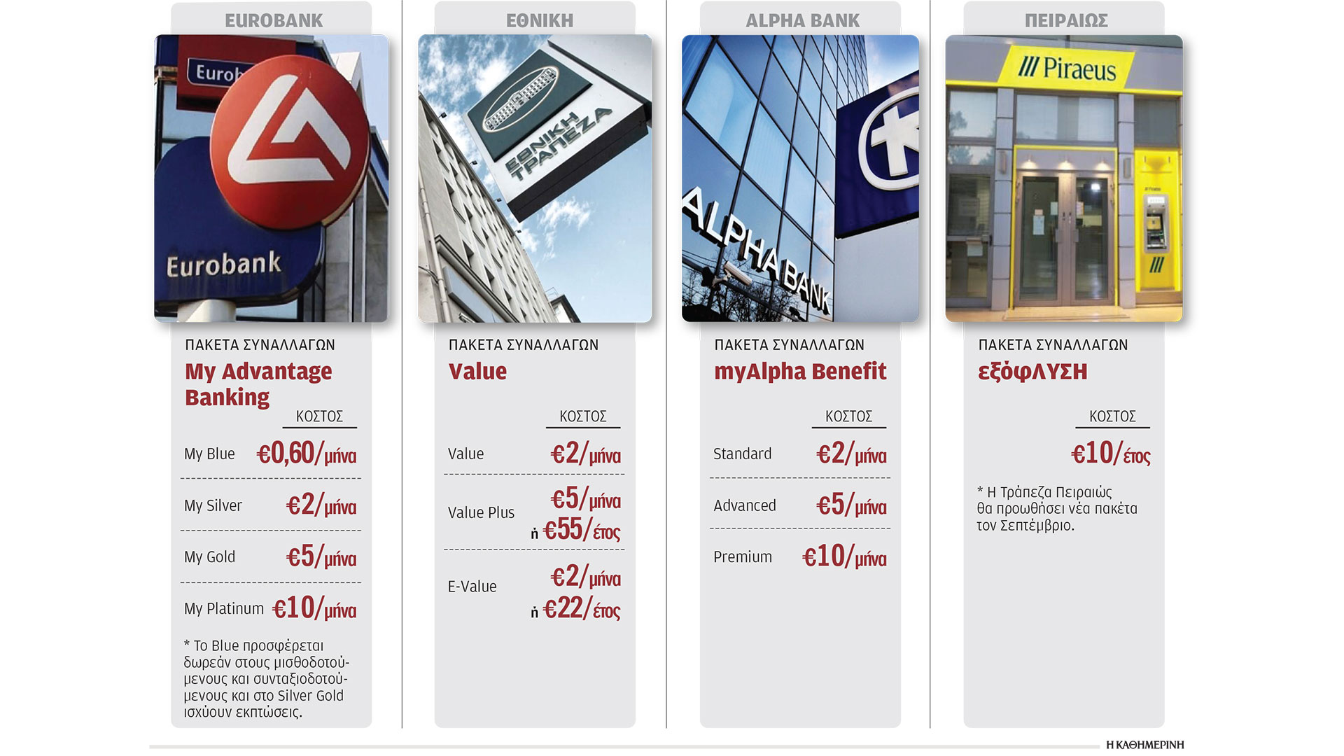 Την αρχή έκανε η Eurobank με τα πακέτα συναλλαγών My Advantage Banking, που προώθησε πριν από ένα χρόνο και τα οποία εμπλουτίστηκαν από τις 2 Αυγούστου με νέες υπηρεσίες, μειώνοντας ή ακόμα και καταργώντας το κόστος για όσους πελάτες έχουν τη μισθοδοσία ή τη σύνταξή τους στην τράπεζα. Οι βελτιώσεις αφορούν και τα τέσσερα πακέτα που παρέχει η Eurobank (My Blue Advantage, My Silver Advantage, My Gold Advantage και My Platinum Advantage), τα οποία κλιμακωτά εξασφαλίζουν περισσότερα οφέλη για όλους τους πελάτες, για απλές αλλά και για τις πλέον σύνθετες συναλλαγές. Αξίζει να σημειωθεί πως το πιο απλό, και πιο οικονομικό πακέτο My Blue Advantage με ελάχιστο κόστος 0,60 λεπτά τον μήνα, προσφέρεται εντελώς δωρεάν σε πελάτες που λαμβάνουν τη μισθοδοσία ή τη σύνταξή τους από τη Eurobank και την έχουν επιλέξει ως βασική τράπεζα συνεργασίας. Οσοι επιλέγουν αυτό το πακέτο, μπορούν πλέον να κάνουν δωρεάν απεριόριστες πάγιες εντολές για αυτόματη πληρωμή λογαριασμών, σε σχέση με τη μόλις μία που ίσχυε πριν από την αναβάθμιση, ενώ δωρεάν θα είναι σε αυτό το πακέτο μεταξύ άλλων και η έκδοση ή η 5ετής ανανέωση χρεωστικής κάρτας, όπως επίσης η επανέκδοσή της λόγω φθοράς ή κλοπής. Το κόστος ξεκινάει από 0,60 ευρώ και κλιμακώνεται στα 2, 5 και 10 ευρώ τον μήνα για τα πακέτα Silver, Gold και Platinum, ενώ έκπτωση στο μηνιαίο πάγιο των 2 και 5 ευρώ τον μήνα έχουν και οι μισθοδοτούμενοι ή συνταξιοδοτούμενοι των πακέτων Silver και Gold. Το όφελος σύμφωνα με τους υπολογισμούς της τράπεζας ξεκινάει από 3 ευρώ για κάποιον που έχει τη μισθοδοσία του στη Eurobank, κλιμακώνεται στα 14 ευρώ κατά μέσον όρο για κάποιον που θα επιλέξει το πιο αναβαθμισμένο πακέτο και μπορεί να φτάσει ακόμη και τα 52 ευρώ τον μήνα για κάποιον που χρησιμοποιεί συχνά τον λογαριασμό του και επιλέξει το full πακέτο (Platinum) με τη χρέωση των 10 ευρώ τον μήνα. Η Eurobank δίνει τη δυνατότητα να τηρεί κάποιος τον λογαριασμό του στην τράπεζα δωρεάν χωρίς κόστος με την προϋπόθεση ότι δεν θα χρησιμοποιεί τον λογαριασμό αυτόν για συναλλαγές και ότι θα είναι αποταμιευτικός. Σύμφωνα με στοιχεία της τράπεζας, ήδη 2,3 εκατ. πελάτες έχουν εγγραφεί στο «My Blue Advantage», ενώ άλλοι 150.000 έχουν επιλέξει τα πακέτα Silver, Gold και Platinum.