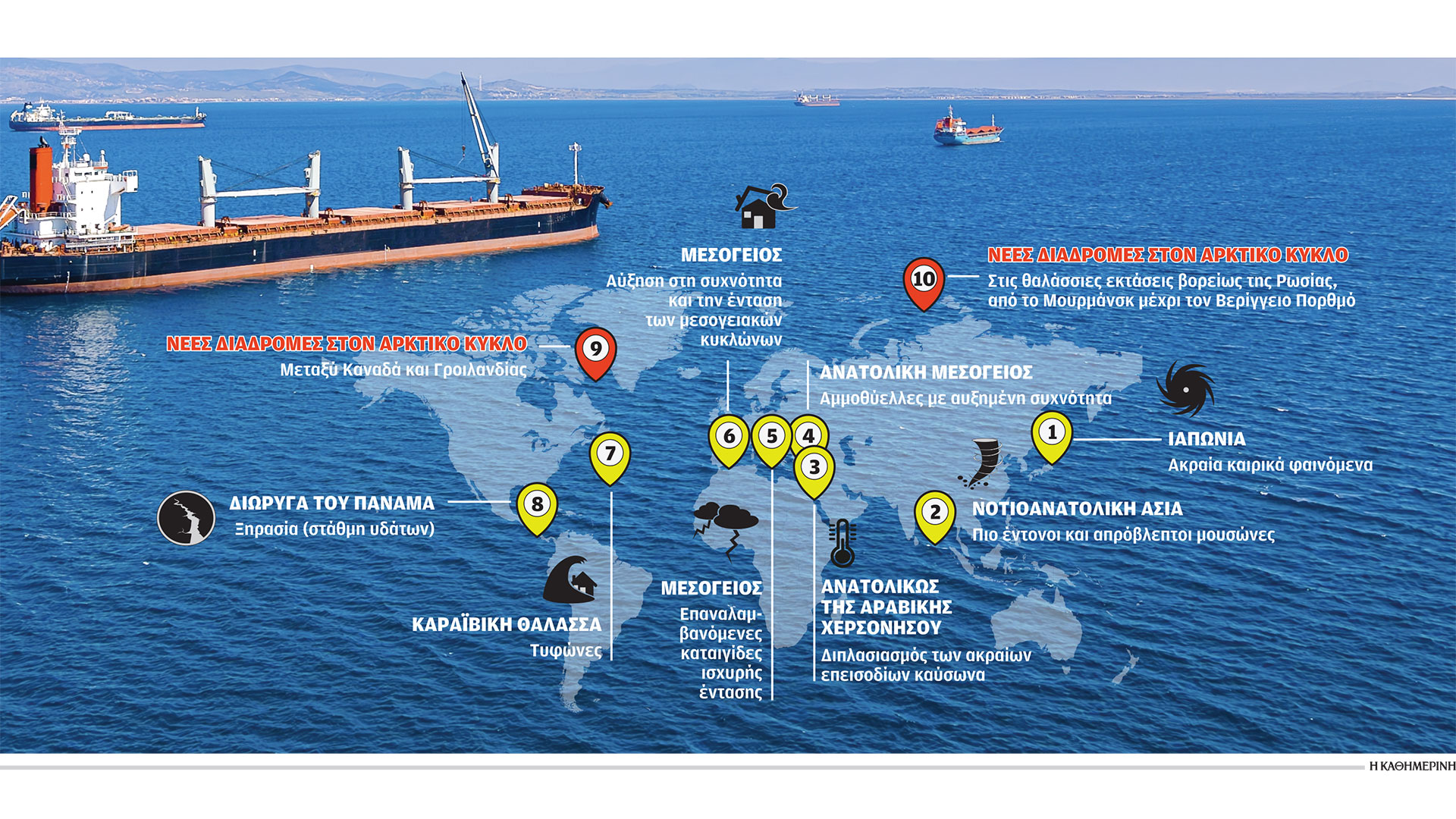 Μια υποθετική διαδρομή ενός πλοίου από την Ιαπωνία στον Παναμά μέσω της Διώρυγας του Σουέζ και της Μεσογείου αποκαλύπτει μια σειρά από νέους κινδύνους όπως ενισχύονται ή και προκαλούνται λόγω της κλιματικής αλλαγής. Αυξημένα περιστατικά καύσωνα, τυφώνα, καταιγίδας και ανεμοθύελλας θα συναντήσουν τα πλοία, οδηγώντας σε πιθανές καθυστερήσεις –κυρίως στα λιμάνια– και στην ανάγκη κατάρτισης κλιματικού κινδύνου για το δρομολόγιο. O Κωνσταντίνος Καρτάλης, καθηγητής Φυσικής Περιβάλλοντος και Κλίματος του ΕΚΠΑ και μέλος της Επιστημονικής Επιτροπής της Ευρωπαϊκής Ενωσης για την Κλιματική Αλλαγή, εξηγεί τους κινδύνους.