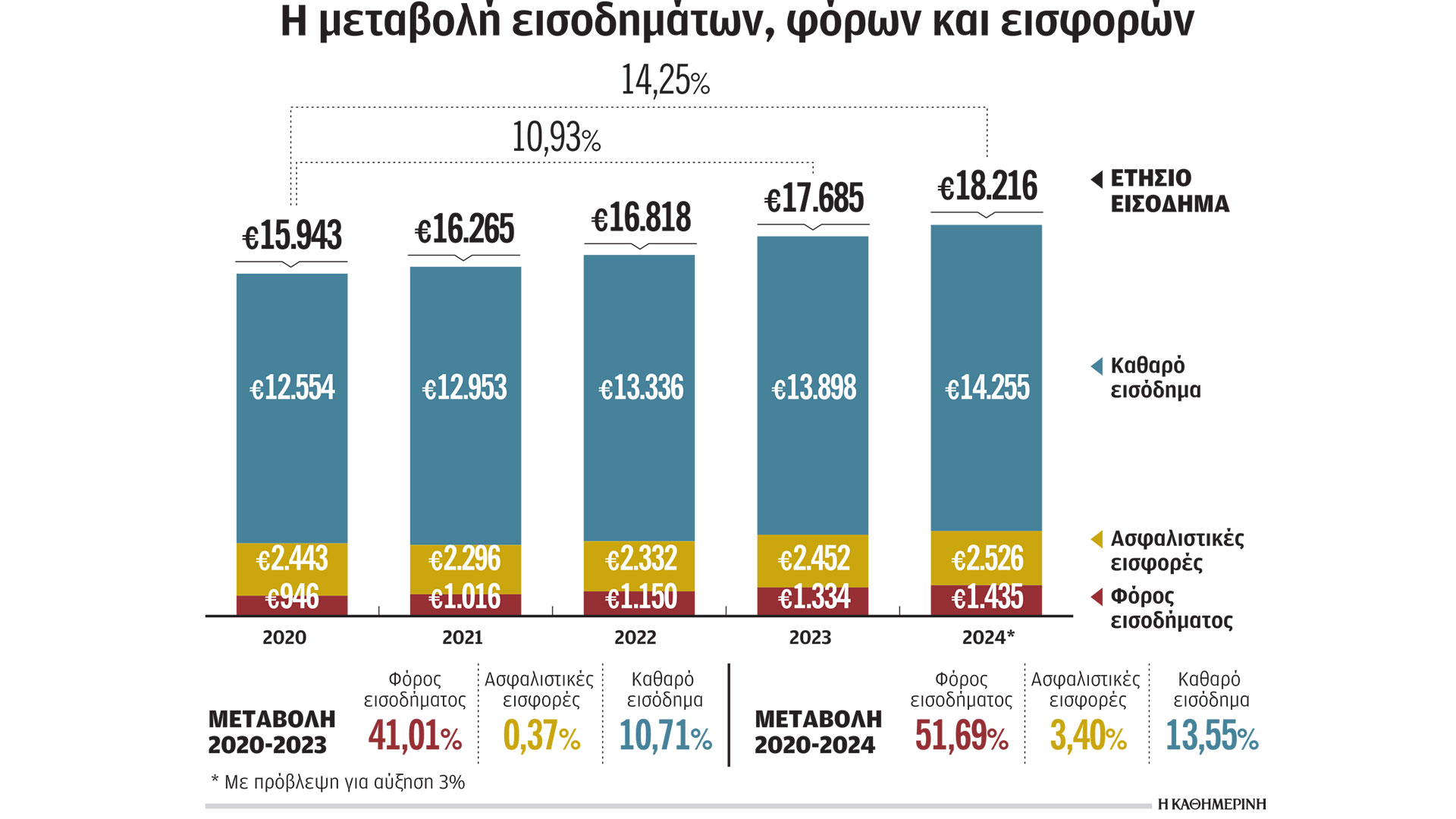 Με βάση τα στοιχεία του ΟΟΣΑ, οι μέσες μεικτές αποδοχές το 2020 είχαν υποχωρήσει –και λόγω του lockdown που επέφερε η πανδημία– σε 15.943 ευρώ. Σε αυτό το ποσό αντιστοιχούσε τότε φόρος 946 ευρώ (μαζί με την εισφορά αλληλεγγύης που καταργήθηκε στη συνέχεια) αλλά και ασφαλιστικές εισφορές 2.443 ευρώ. Ετσι, οι μέσες καθαρές αποδοχές για τη συγκεκριμένη χρονιά ήταν 12.554 ευρώ, Από το 2021 και μετά, το μεικτό μέσο εισόδημα άρχισε να αυξάνεται, με την αναπροσαρμογή του κατώτατου μισθού να δίνει σημαντική ώθηση προς αυτή την κατεύθυνση. Στο τέλος του 2023, οι μεικτές αποδοχές εκτιμήθηκαν από τον ΟΟΣΑ σε 17.685 ευρώ. Αυτό το ποσό είναι αυξημένο κατά 10,93% σε σχέση με τα επίπεδα του 2020. Ο φόρος εισοδήματος, όμως, από τα 946 ευρώ το 2020 έχει διαμορφωθεί στα 1.334 ευρώ παρά το γεγονός ότι στο μεσοδιάστημα καταργήθηκε η εισφορά αλληλεγγύης. Δηλαδή, ενώ το μεικτό εισόδημα έχει αυξηθεί κατά 10,93%, ο φόρος εισοδήματος έχει ανέβει στην περίοδο 2020-2023 κατά 41,01%, κάτι που ροκανίζει το καθαρό εισόδημα. Ουσιαστικά, αυτή η αύξηση εκμηδένισε το όφελος από τη μείωση των ασφαλιστικών εισφορών και την κατάργηση της εισφοράς αλληλεγγύης, όπως επίσης και τη μείωση του πρώτου συντελεστή της φορολογικής κλίμακας στο 9%. Ενώ ο εργαζόμενος με το μέσο εισόδημα πλήρωσε 2.443 ευρώ στον e-ΕΦΚΑ, το 2023 κατέβαλε 2.452 ευρώ παρά την αύξηση του ονομαστικού εισοδήματος. Οι εισφορές αυξήθηκαν πάντως μόνο κατά 0,37% ενώ το ονομαστικό εισόδημα κατά 10,93%. Υποτίθεται ότι οι μειώσεις των συντελεστών υπολογισμού των ασφαλιστικών εισφορών αλλά και η κατάργηση της εισφοράς αλληλεγγύης όπως και οι μειώσεις των συντελεστών της κλίμακας φορολογίας εισοδήματος φυσικών προσώπων (σ.σ νομοθετήθηκαν το 2019) είναι παρεμβάσεις με στόχο την αύξηση του διαθέσιμου εισοδήματος. Τελικώς, όμως, η αύξηση του καθαρού εισοδήματος είναι το διάστημα 2020-2023 αντίστοιχη με την αύξηση του ονομαστικού εισοδήματος, κάτι που σημαίνει ότι τα οφέλη από τις μειώσεις των συντελεστών υπολογισμού φόρων και εισφορών έχουν ήδη εκμηδενιστεί από πέρυσι: κατά 10,93% αυξήθηκε το ονομαστικό εισόδημα, κατά 10,71% έχει μεταβληθεί το διαθέσιμο.