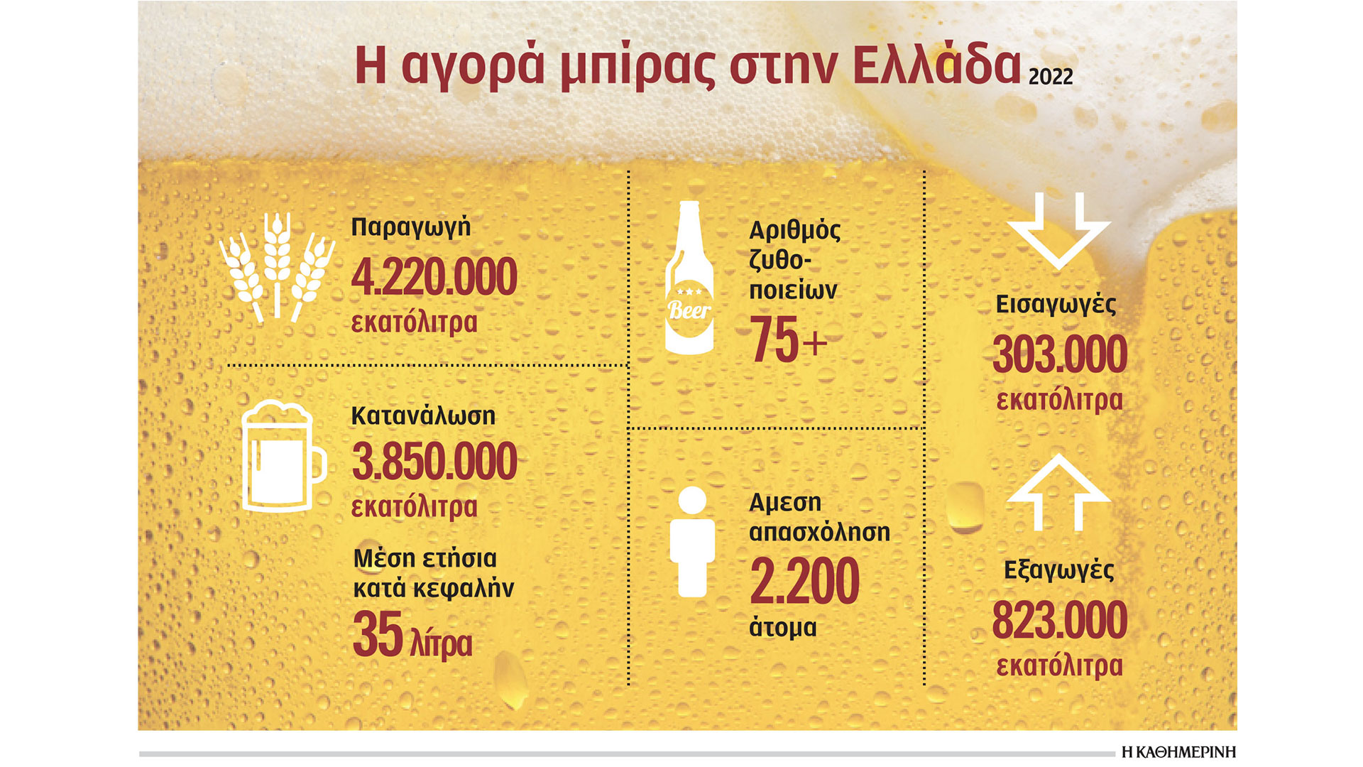 Σύμφωνα με τα τελευταία διαθέσιμα στοιχεία (2022), η παραγωγή μπίρας στην Ελλάδα διαμορφώθηκε σε 4,22 εκατ. εκατόλιτρα από 3,75 εκατ. εκατόλιτρα το 2013. Η κατά κεφαλήν κατανάλωση παραμένει χαμηλή στην Ελλάδα συγκριτικά με την υπόλοιπη Ευρώπη, ενώ πλέον υπολογίζεται πως το 60% της κατανάλωσης γίνεται στη λεγόμενη «κρύα αγορά» (καφεστίαση).