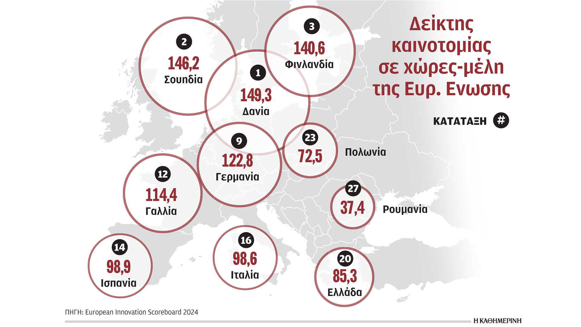 O δείκτης καινοτομίας (Innovation Index) της Ελλάδας διαμορφώνεται στο 85,3, όταν ο μέσος όρος της Ε.Ε. είναι στο 110. Στη συγκεκριμένη ομάδα βρίσκονται η Σλοβενία (100,1), η Ισπανία, η Τσεχία, η Ιταλία, η Μάλτα, η Λιθουανία και η Πορτογαλία, ενώ τις δύο τελευταίες θέσεις συμπληρώνουν η Ελλάδα και η Ουγγαρία (77,6). Αν και από το 2011 η χώρα μας έχει σημειώσει εμφανή πρόοδο σε μια σειρά από δείκτες που διαμορφώνουν τις επιδόσεις της γύρω από την καινοτομία, βρίσκεται καθηλωμένη στην 20ή θέση (σε σύνολο 27 χωρών), όπως και πριν από 14 χρόνια, ένδειξη πως ακόμη υστερεί σε τομείς-κλειδιά που θα μπορούσαν να συμβάλουν στην ενίσχυση της ανταγωνιστικότητάς της.