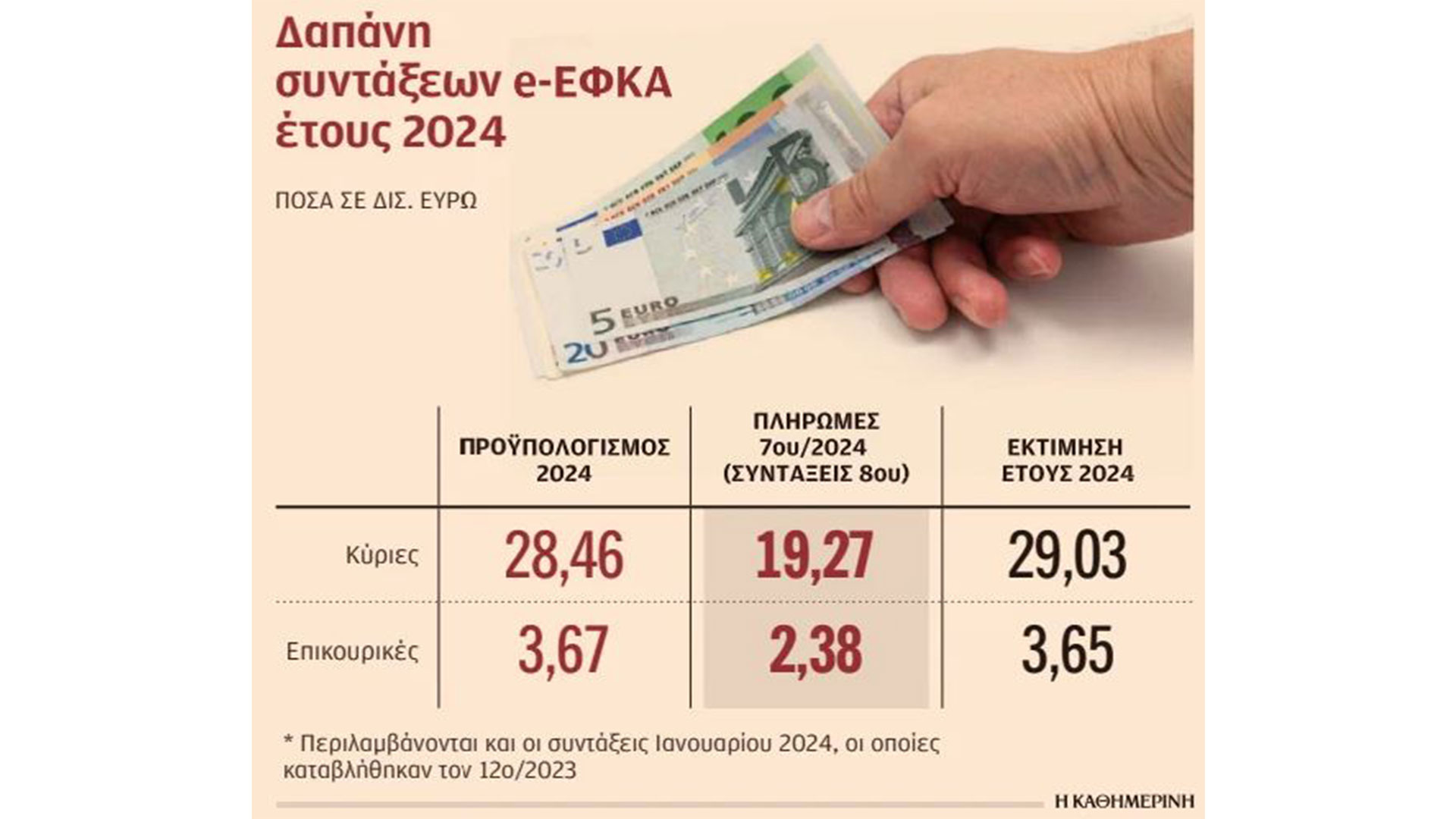 Σε κάθε περίπτωση, το 2024 θα κλείσει με συνολικές δαπάνες της τάξης των 29,027 δισ. ευρώ για κύριες συντάξεις, αυξημένες κατά 570 εκατ. ευρώ σε σχέση με τα 28,450 δισ. που αρχικά είχαν προϋπολογιστεί. Στον αντίποδα, οι δαπάνες για επικουρικές συντάξεις θα είναι τελικά μειωμένες κατά περίπου 20 εκατ. ευρώ, στα 3,650 δισ. ευρώ.