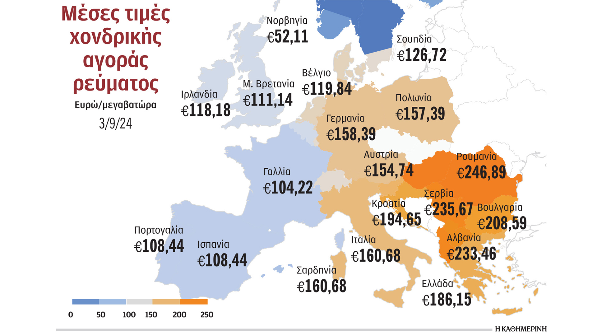 Οι τιμές ρεύματος στις χονδρεμπορικές αγορές της Νοτιοανατολικής Ευρώπης διαμορφώνονται σταθερά από τον Ιούλιο σε διπλάσια επίπεδα από αυτά των αγορών της Κεντρικής και Δυτικής Ευρώπης. Στην Ελλάδα η μέση τιμή της μεγαβατώρας διαμορφώθηκε χθες στα 215,29 ευρώ, τις βραδινές ώρες η τιμή έφτασε στα 780 ευρώ, ενώ για σήμερα Τρίτη η μέση τιμή υποχωρεί στα 186 ευρώ, με τη μέγιστη τις βραδινές ώρες να φτάνει στα 911 ευρώ. Στα 246,89 ευρώ διαμορφώνεται η τιμή της μεγαβατώρας στην αγορά της Ρουμανίας, στα 241 ευρώ στην Ουγγαρία, στα 238 ευρώ στο Μαυροβούνιο, στα 235,67 ευρώ στη Σερβία και στα 233,46 ευρώ στην Αλβανία.