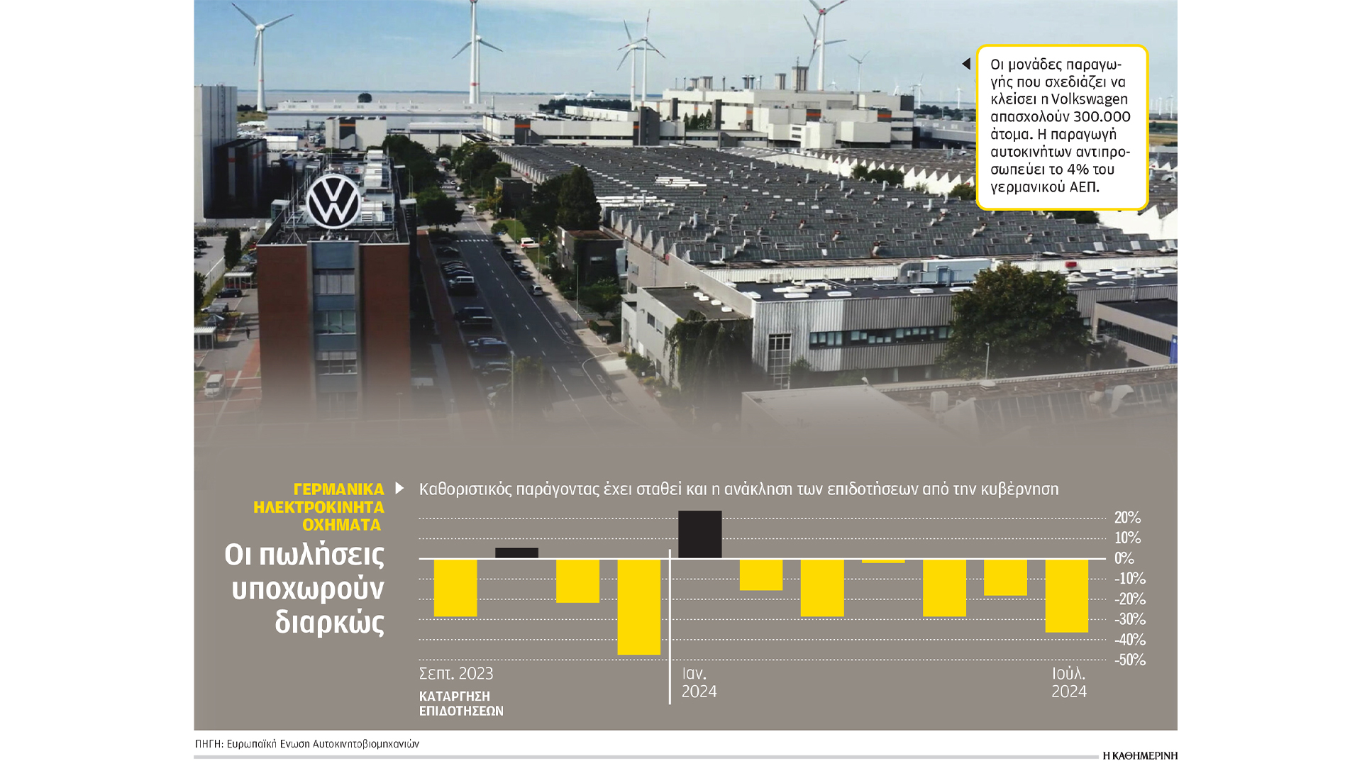Και παράλληλα μια μειωμένη ζήτηση στην εγχώρια αγορά της, απότοκο του πληθωρισμού που έχει γονατίσει την αγοραστική δύναμη των Ευρωπαίων. Αντιμετώπισε τον κίνδυνο της αποβιομηχάνισης, βλέποντας τους κολοσσούς της να μεταφέρουν επενδύσεις τους στις ΗΠΑ για να επωφεληθούν από τις επιδοτήσεις του πακέτου Μπάιντεν στις πράσινες επενδύσεις. Και τώρα γνωρίζει μια πρωτοφανή εξέλιξη, βλέποντας το σύμβολο της γερμανικής ανάπτυξης, το «αυτοκίνητο του λαού», τη Volkswagen, να σχεδιάζει για πρώτη φορά στα 87 χρόνια της ιστορίας της το λουκέτο σε μονάδες της που απασχολούν 300.000 ανθρώπους.