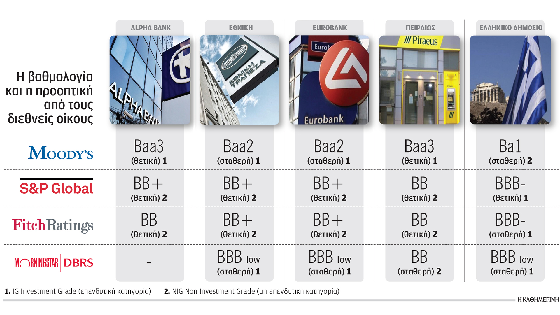 Με βάση τη μεθοδολογία της S&P Alpha, Εθνική και Eurobank βρίσκονται μια βαθμίδα κάτω από την επενδυτική κατηγορία και η Πειραιώς απέχει δύο βαθμίδες, ενώ με βάση τη μεθοδολογία της Fitch, Εθνική και Eurobank απέχουν μια βαθμίδα από την επενδυτική κατηγορία και Πειραιώς και Alpha δύο βαθμίδες.