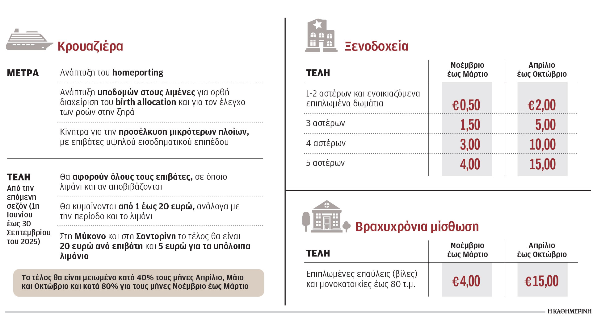 Τα τέλη σε κρουαζιέρα, ξενοδοχεία, ενοικιαζόμενα δωμάτια και τουριστικές μισθώσεις θα αυξομειώνονται ανάλογα με την περίοδο.