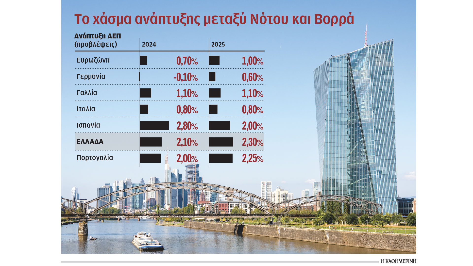 Σύμφωνα με τις εκτιμήσεις της, η Γερμανία θα καταγράψει φέτος αρνητική ανάπτυξη, στο -0,1%, ενώ το 2025 θα κινηθεί με ρυθμούς της τάξεως του 0,6%. Η ανάπτυξη στην Ισπανία φέτος θα διαμορφωθεί στο 2,8% και το 2025 στο 2%, ενώ στην Ελλάδα θα κινηθεί στο 2,1% φέτος και στο 2,3% το 2026 και στην Πορτογαλία στο 2% και 2,25% τα δύο έτη, αντιστοίχως.