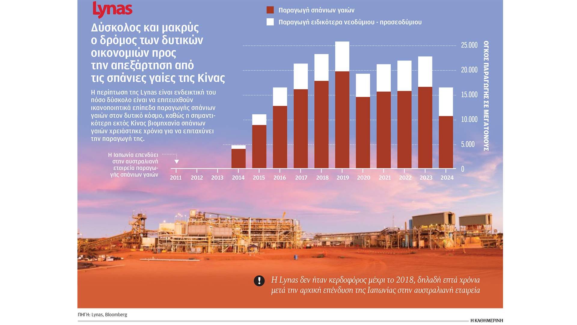 Σε ό,τι αφορά την αυστραλιανή Lynas Rare Earths, έχει δεσμευθεί πως θα κατασκευάσει μονάδα επεξεργασίας στο Τέξας και έχει κλείσει ήδη συμβόλαια αξίας 300 εκατ. με το Πεντάγωνο, καθώς ευελπιστεί πως η μονάδα θα είναι έτοιμη και θα αρχίσει να λειτουργεί σε δύο χρόνια. Η πτώση των τιμών όμως αποβαίνει εις βάρος της Lynas και καθυστερεί το σχέδιο. Κάτι ανάλογο έχει συμβεί και με την προσπάθεια της Ιαπωνίας να απεξαρτηθεί από τις σπάνιες γαίες της Κίνας εδώ και περισσότερο από μία δεκαετία. Η πορεία αυτής της προσπάθειας καταδεικνύει πως χρειάζεται χρόνος για να αποφέρει αποτελέσματα. Η Ιαπωνία επένδυσε στη Lynas 250 εκατ. δολ. από το 2011, όταν το Πεκίνο διέκοψε την προσφορά σπάνιων γαιών εν μέσω έντασης ανάμεσα στις δύο χώρες γύρω από μακροχρόνιες εδαφικές διαφορές τους. Πέρασαν δύο χρόνια μέχρις ότου να αρχίσει να παράγει η συγκεκριμένη μονάδα, ενώ και πάλι εξαιτίας της πτώσης των τιμών η επένδυση δεν απέδωσε παρά μόνο το 2018, όταν η Lynas παρουσίασε κερδοφορία για πρώτη φορά. Οπως χαρακτηριστικά τονίζει η Αμάντα Λακάζε, διευθύνουσα σύμβουλος της Lynas, θα χρειαστεί μεγάλη υπομονή από πλευράς των επενδυτών των ορυχείων, και η Δύση αν θέλει να αναπτύξει μια επαρκή βιομηχανία σπάνιων γαιών πρέπει να αποδεχθεί ότι θα είναι μια μακροχρόνια προσπάθεια και για πολύ καιρό χωρίς κέρδη. Η Ιαπωνία κατόρθωσε τελικά να μειώσει την εξάρτησή της από τις σπάνιες γαίες της Κίνας περιορίζοντάς την περίπου στο 60% από το 80% έως 90% που ήταν στο παρελθόν.