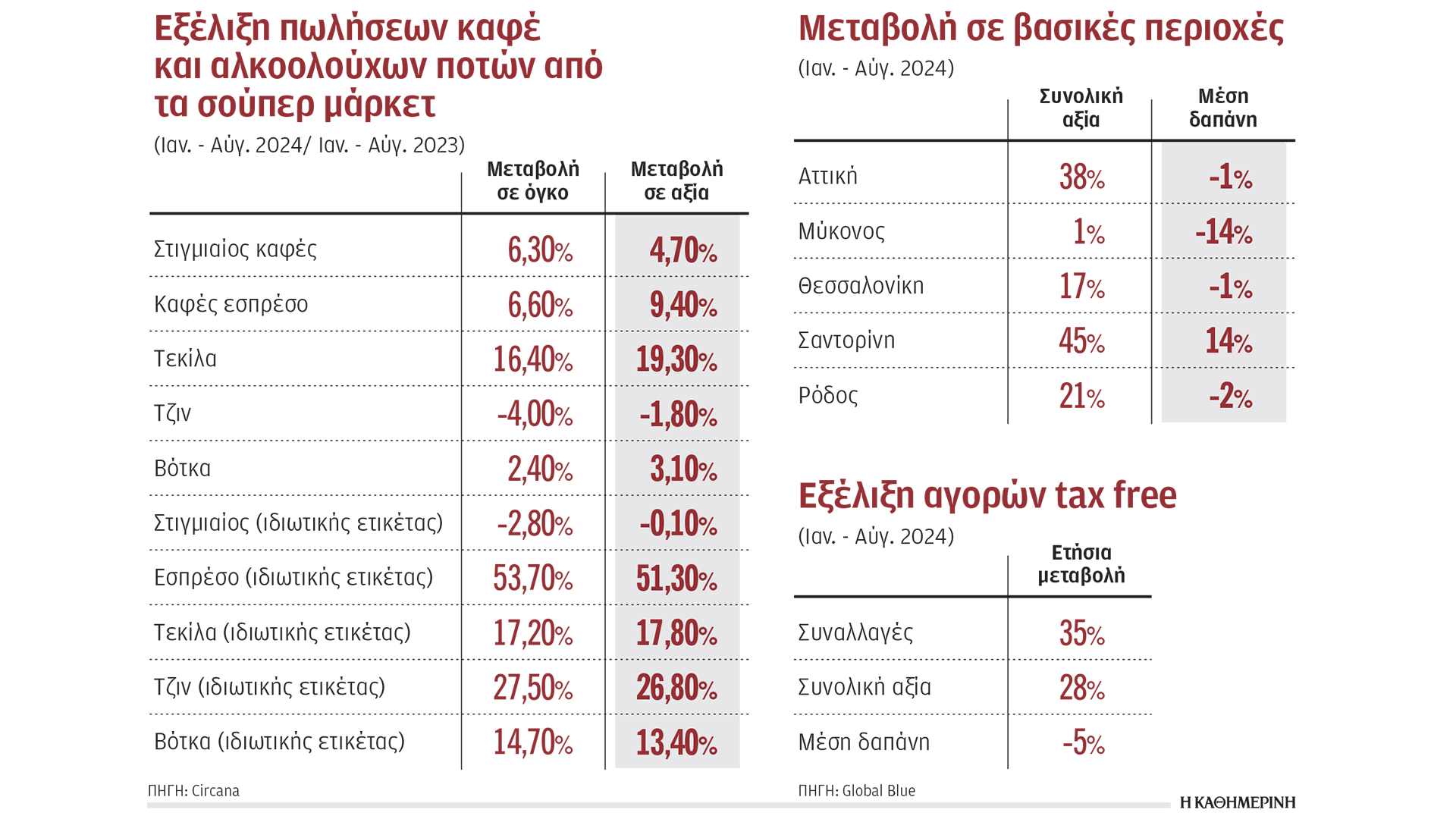 Αντίστοιχες τάσεις καταγράφονται και στις πωλήσεις αλκοολούχων ποτών. Σύμφωνα με τα στοιχεία της Circana στο οκτάμηνο Ιανουαρίου – Αυγούστου 2024, στοιχεία που αφορούν το κανάλι του σούπερ μάρκετ, οι πωλήσεις σε όγκο τεκίλας και βότκας αυξήθηκαν κατά 16,4% και 2,4% σε σύγκριση με το αντίστοιχο διάστημα του 2023. Αν και αποτελούν μικρό ποσοστό των συνολικών πωλήσεων –της τάξης του 5% με 6%– έχει ιδιαίτερο ενδιαφέρον ότι παρατηρείται και στην περίπτωση των αλκοολούχων, προϊόντων όπου υπάρχει στενή σύνδεση του καταναλωτή με το επώνυμο σήμα, πολύ μεγάλη αύξηση των πωλήσεων ποτών ιδιωτικής ετικέτας: 27,5% στο τζιν, 17,2% στην τεκίλα, 14,7% στη βότκα. «Οι ξένοι τουρίστες και ειδικά όσοι προέρχονται από χώρες της Βόρειας Ευρώπης έχουν συνηθίσει να καταναλώνουν αλκοόλ εντός του σπιτιού και όχι έξω. Οπότε το να ακολουθούν αυτή την τάση και στις διακοπές τους δεν είναι κάτι ξένο προς αυτούς», τονίζει στην «Κ» στέλεχος του κλάδου αλκοολούχων.