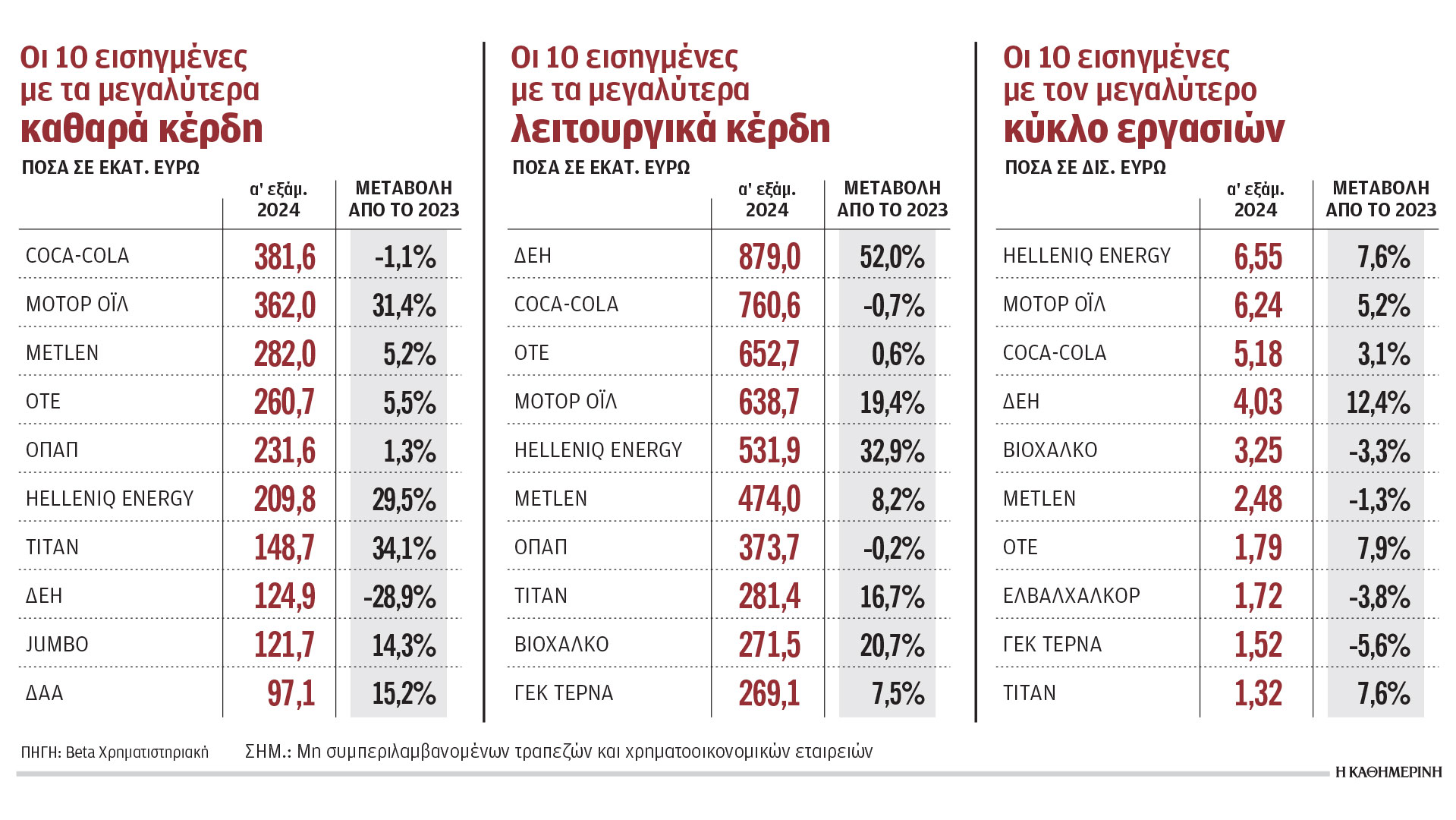 Τα λειτουργικά κέρδη εκτινάχθηκαν επίσης σε ιστορικά υψηλά σε εξαμηνιαία βάση και στα 7,58 δισ. ευρώ, σημειώνοντας αύξηση 15%. Ο τζίρος ενισχύθηκε κατά 6,1% και διαμορφώθηκε στα 47,33 δισ., παρά την πολύ υψηλή βάση σύγκρισης του 2023, όταν οι ενεργειακές εταιρείες είχαν ιδιαίτερα υψηλή συνεισφορά από τις υψηλές τιμές στη χονδρική ρεύματος (+40%).