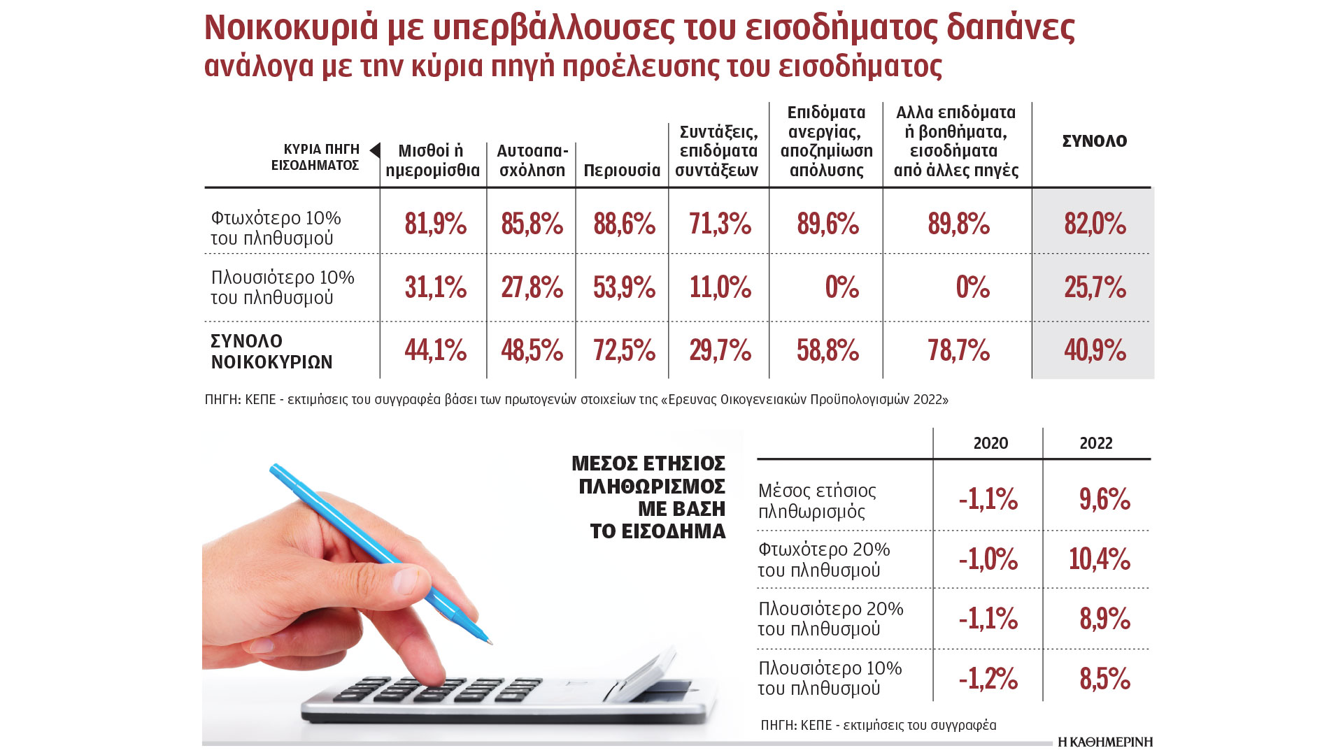 Η ανελαστικότητα που χαρακτηρίζει ειδικά τις δαπάνες για τρόφιμα και στέγαση έχει ως αποτέλεσμα να παρατηρείται τα τελευταία χρόνια, λόγω των ανατιμήσεων, αύξηση του ποσοστού των νοικοκυριών που δαπανούν περισσότερα από το εισόδημά τους. Ετσι από 35,9% το 2020, το ποσοστό των νοικοκυριών με υπερβάλλουσες του εισοδήματός τους δαπάνες έφτασε το 2022 στο 40,9%. Το μέσο νοικοκυριό με υπερβάλλουσες δαπάνες δαπανά ποσά που υπερβαίνουν το εισόδημά του κατά 47,4%, ενώ σε εξαιρετικά δυσμενή θέση βρίσκονται τα νοικοκυριά με κύρια πηγή εισοδήματος τα επιδόματα ανεργίας είτε άλλα επιδόματα και βοηθήματα, καθώς οι δαπάνες τους είναι υπερδιπλάσιες του εισοδήματος (ακόμη και 167,8% πάνω).