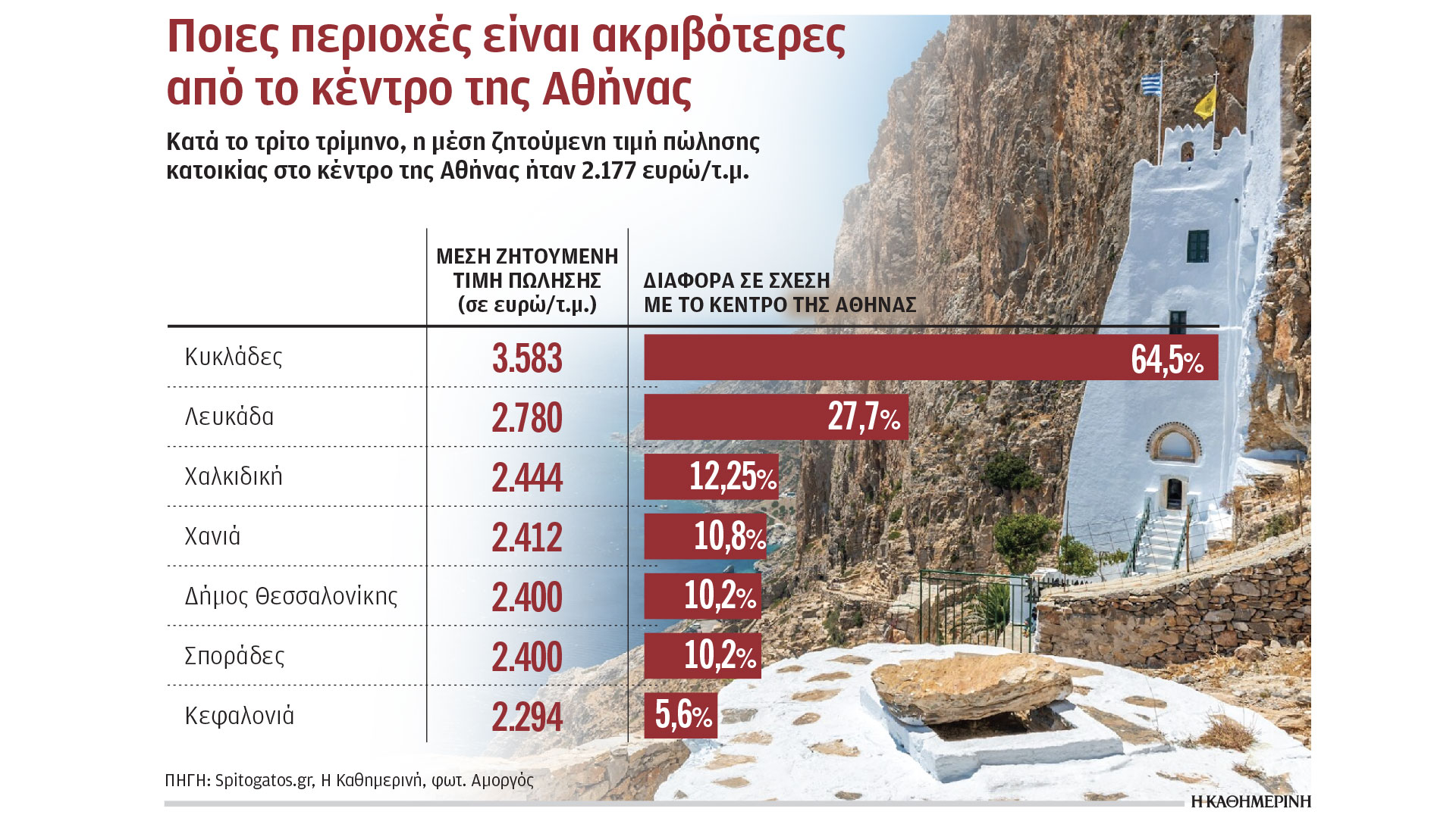 Ακριβότερες σε σχέση με το κέντρο της Αθήνας είναι όμως κι άλλες περιοχές, κυρίως στη νησιωτική χώρα. Στη Λευκάδα, η μέση ζητούμενη τιμή αγγίζει τα 2.780 ευρώ/τ.μ. και είναι 27,7% υψηλότερη από την Αθήνα. Στα Χανιά, η απόκλιση είναι κατά 10,8% σε 2.412 ευρώ/τ.μ., ενώ στις Σποράδες, οι τιμές είναι 10,2% υψηλότερες, καθώς διαμορφώνονται σε 2.400 ευρώ/τ.μ. Στην κατηγορία αυτή εντάσσεται και η Κεφαλονιά, όπου η μέση ζητούμενη τιμή αγγίζει πλέον τα 2.294 ευρώ/τ.μ., 5,6% υψηλότερα από την Αθήνα.