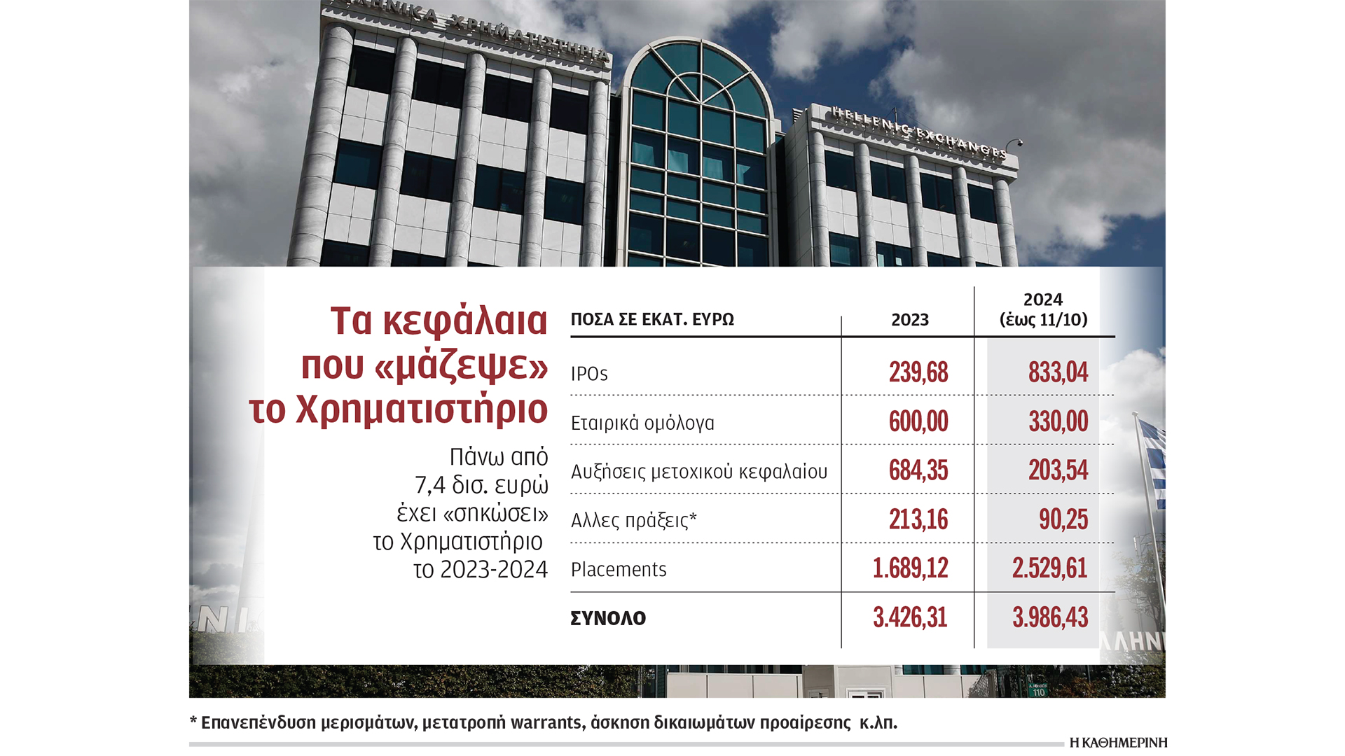 Επίσης, έως τώρα το 2024 έχουν γίνει δύο εκδόσεις ομολόγων στο Χ.Α. από τις Autohellas, Intralot (στο α΄ τρίμηνο), συνολικού ύψους 330 εκατ. ευρώ, και τρεις αυξήσεις μετοχικού κεφαλαίου από Interwood, Doppler και Cenergy, συνολικού ύψους 203,54 εκατ. ευρώ. Από άλλες εταιρικές πράξεις, όπως μετατροπή warrants, άσκηση warrants και επανεπένδυση μερίσματος, τοποθετήθηκαν άλλα 90,3 εκατ. ευρώ. Μέσω των placements –ΓΕΚ ΤΕΡΝΑ, Τράπεζα Πειραιώς, Jumbo, Metlen, Κρι Κρι, Austriacard, Εθνική Τράπεζα– τοποθετήθηκαν συνολικά 2,53 δισ. ευρώ.