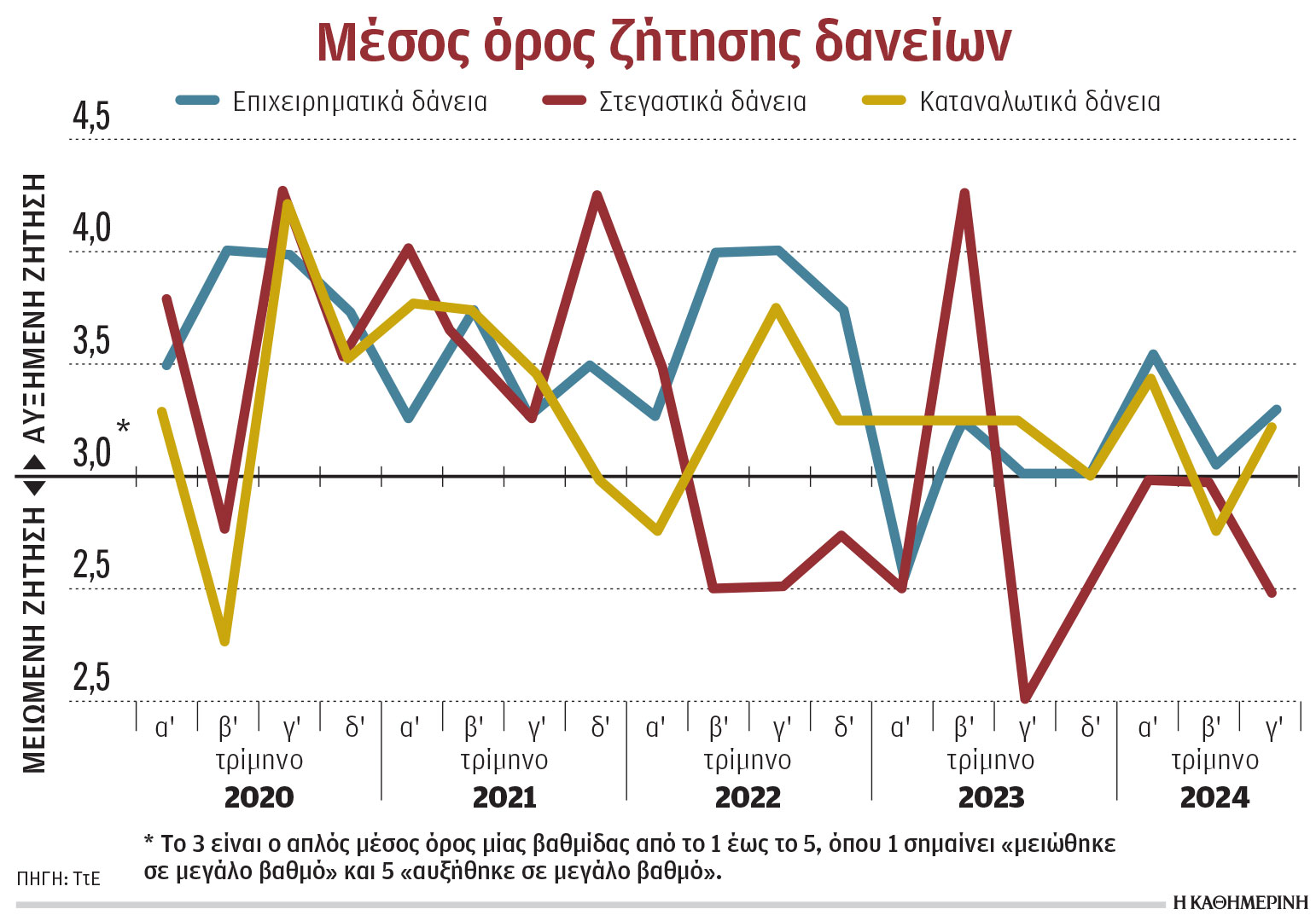 Την τάση αυτή επιβεβαιώνει η έρευνα τραπεζικών χορηγήσεων που πραγματοποιεί η ΤτΕ για τις συνθήκες χρηματοδότησης το γ΄ τρίμηνο του έτους και τις προοπτικές για το επόμενο τρίμηνο, η οποία δείχνει διατήρηση της αναιμικής ζήτησης έως τα τέλη του έτους με αιχμή τις χρηματοδοτήσεις προς τις επιχειρήσεις και λιγότερο τα καταναλωτικά δάνεια που ανακάμπτουν επίσης κυρίως όμως λόγω των δανείων για την αγορά αυτοκινήτου. Στον αντίποδα βρίσκεται η ζήτηση για στεγαστικά δάνεια, που καταγράφει νέο αρνητικό ρεκόρ, όπως διαπιστώνει η ΤτΕ, «λόγω της στάσης αναμονής που διατηρούν τα νοικοκυριά ενόψει της αναγγελίας του επιδοτούμενου στεγαστικού προγράμματος Σπίτι μου II».