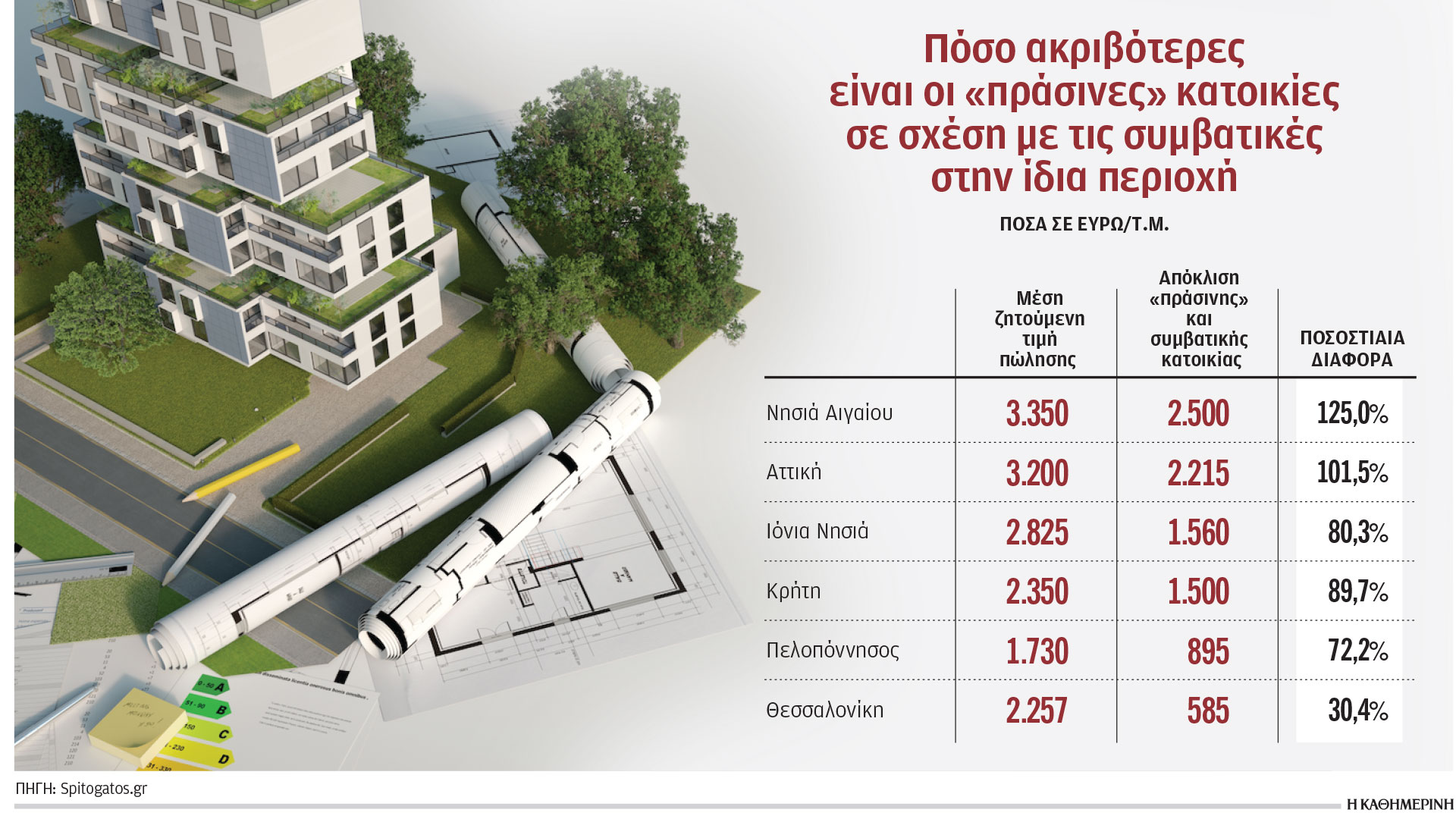 Στο πλαίσιο αυτό, με βάση τα στοιχεία του Spitogatos.gr, παρατηρείται ότι τη μεγαλύτερη απόκλιση εμφανίζουν οι «πράσινες» κατοικίες στα νησιά του Αιγαίου (κυρίως Κυκλάδες), που είναι 125% ακριβότερες συγκριτικά με τα μη αναβαθμισμένα ακίνητα των ίδιων περιοχών. Είναι χαρακτηριστικό ότι μια πράσινη κατοικία πωλείται 2.500 ευρώ/τ.μ. ακριβότερα! Ακολουθεί η περιοχή της Αττικής, όπου η απόκλιση διαμορφώνεται σε 101,5% και 2.213 ευρώ/τ.μ. Με βάση πρόσφατη ανάλυση του Spitogatos.gr, το μεγαλύτερο απόθεμα πωλούμενων «πράσινων» διαμερισμάτων στο λεκανοπέδιο εντοπίζεται στα νότια προάστια με 44%, ενώ ακολουθούν τα βόρεια προάστια με 25% και το κέντρο της Αθήνας με 15%. Οι κατοικίες μεσαίας ενεργειακής κλάσης κατανέμονται πιο ομοιόμορφα σε νότια, βόρεια προάστια και στο κέντρο, με την προσφορά να είναι μικρότερη στα δυτικά και ανατολικά προάστια. Το 50% των κατοικιών χαμηλής ενεργειακής κλάσης βρίσκεται στο κέντρο της Αθήνας, ενώ ακολουθούν τα νότια και δυτικά προάστια.
